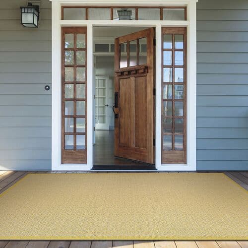The tailored finesse of this durable flat-weave rug is enhanced by its yellow border. It resists fading, water, and mildew, making it perfect for enduring the elements and heavy traffic. A rug pad is recommended to prevent slipping and enhance safety.