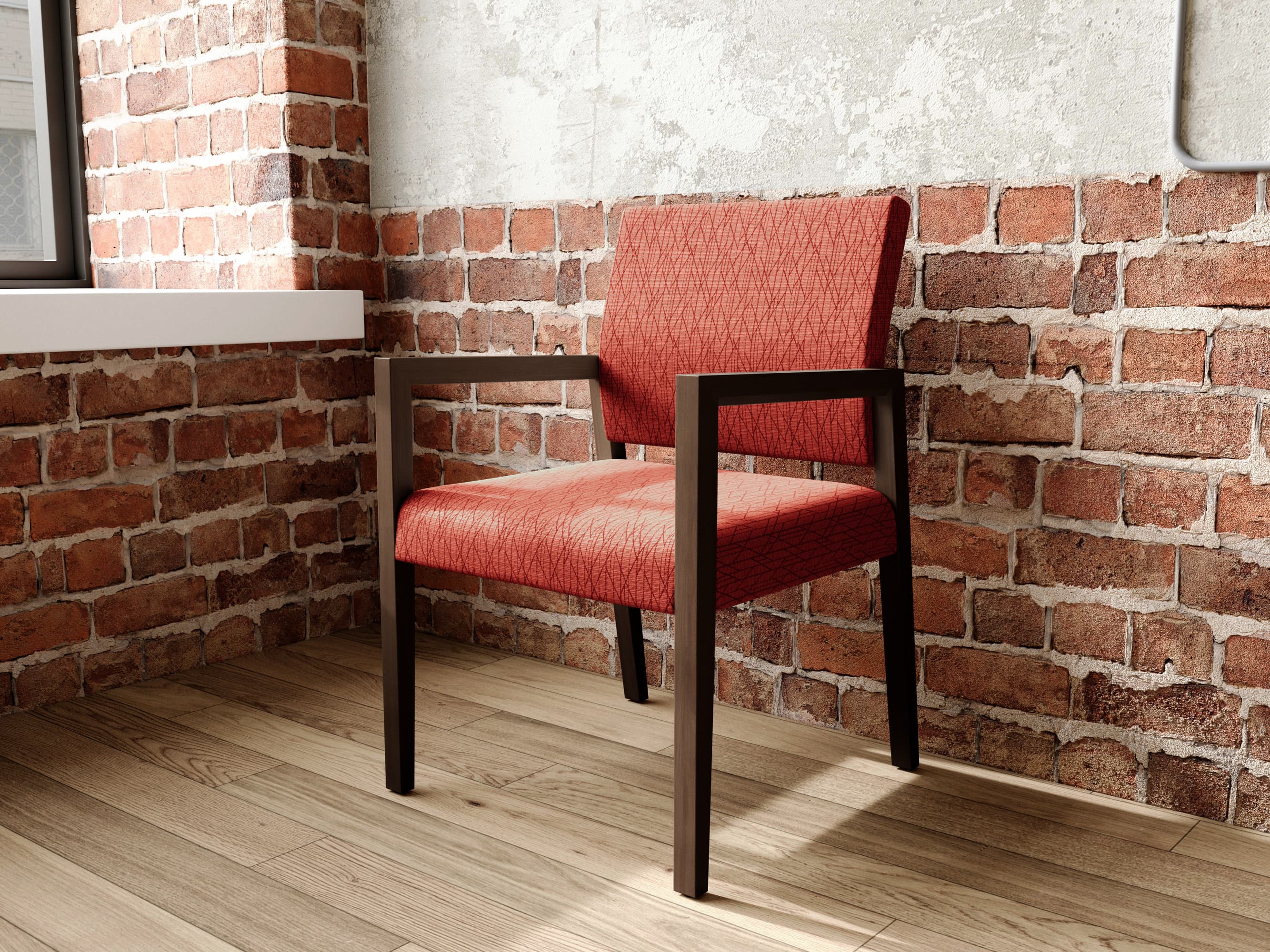 The product with its contemporary geometric styling, distinctive chamfered edge under the armrest, and upholstered seat and back cushions will give your space an elegant, sophisticated look. Features include sturdy hardwood construction and a comfortable Martex seat support system. Choose from the core series of solid fabrics, the axis series of designer patterns, or the Renaissance series of healthcare vinyl. Renaissance is recommended for healthcare environments due to its outstanding cleanability and bacterial resistance.
