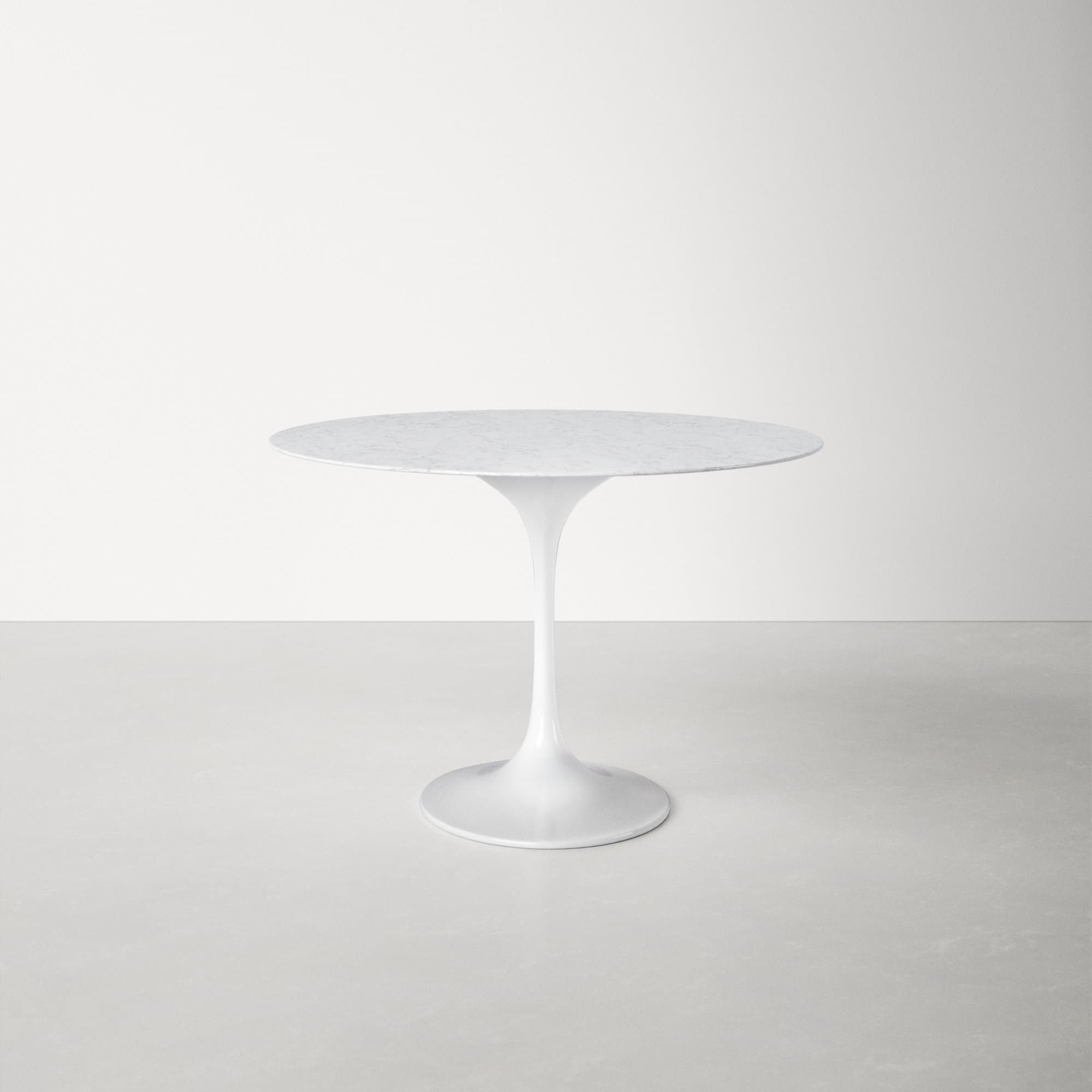 Inspired by an iconic mid-century modern design, this distinctive pedestal dining table lends neo-futuristic style to your dining room or eat-in kitchen. Made with an aluminum frame in a glossy white finish, this charismatic design comfortably seats four around an oval-shaped tabletop. To create an understated ensemble in your open concept eat-in kitchen, start by rolling out a soft global-print area rug for a subtle pop of pattern, then pull four chairs around this stylish dining table. Mount an asymmetrical pendant light from the ceiling to illuminate family meals and dinner parties with friends in a sophisticated glow, and anchor your tablescape with a vase of freshly-cut daffodils as a floral centerpiece for any occasion.