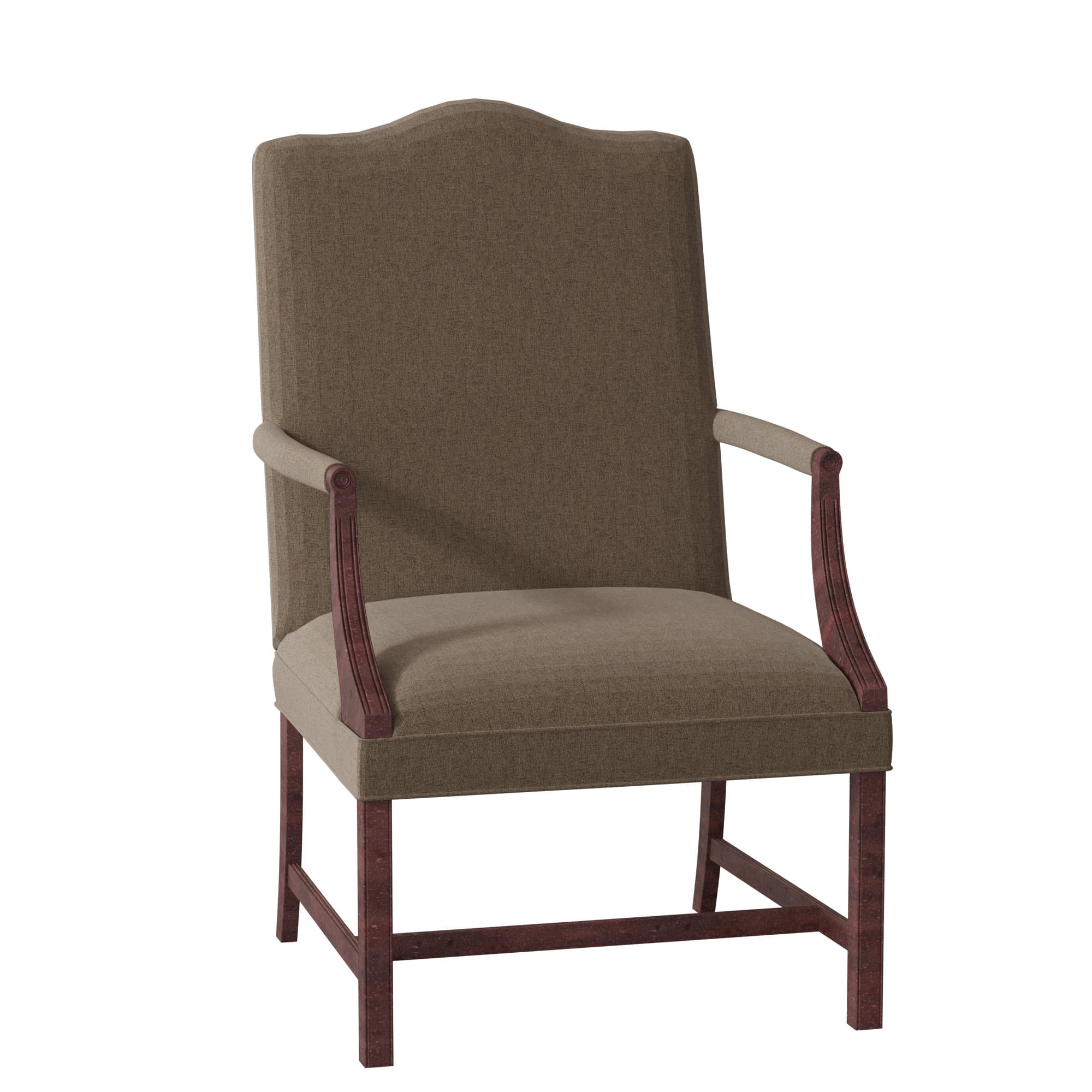 This traditional occasional chair features an arched back shape, padded arms, and exposed wood arm posts. The Chippendale legs have reeded detail and stretchers.