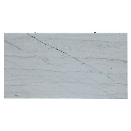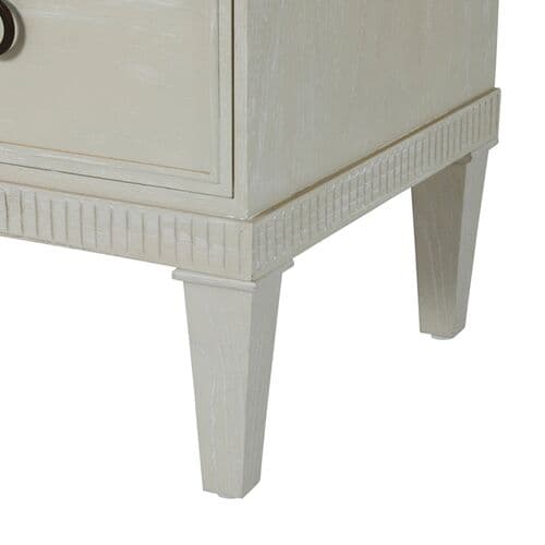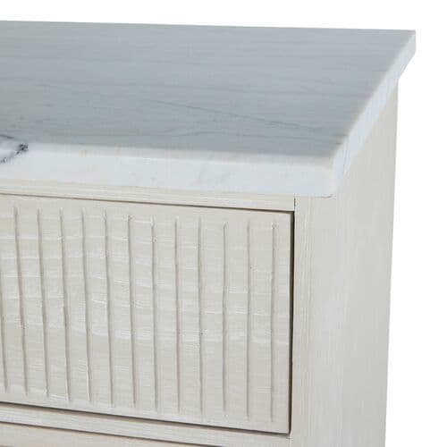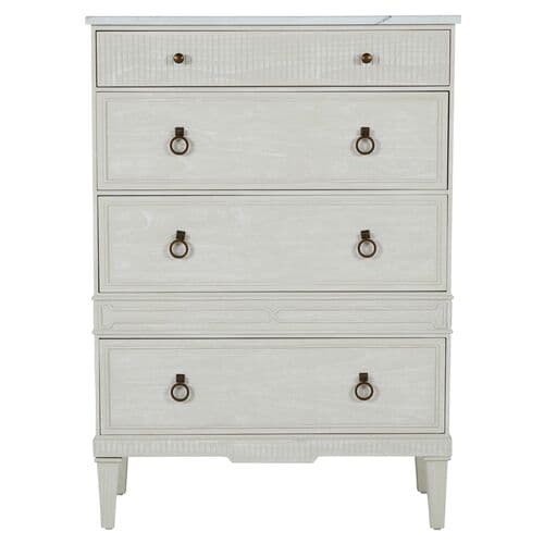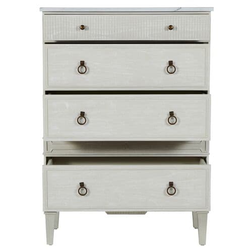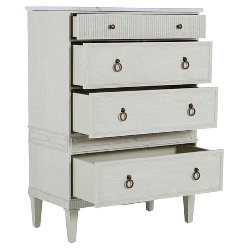 The white marble top adds to the already-considerable elegance of this four-drawer tallboy. Tapered legs, molding between the two lower drawers, and the reeded apron and top drawer front reference Gustavian style. So does the cerused finish, which accentuates the beautiful figuring of the mindi wood.