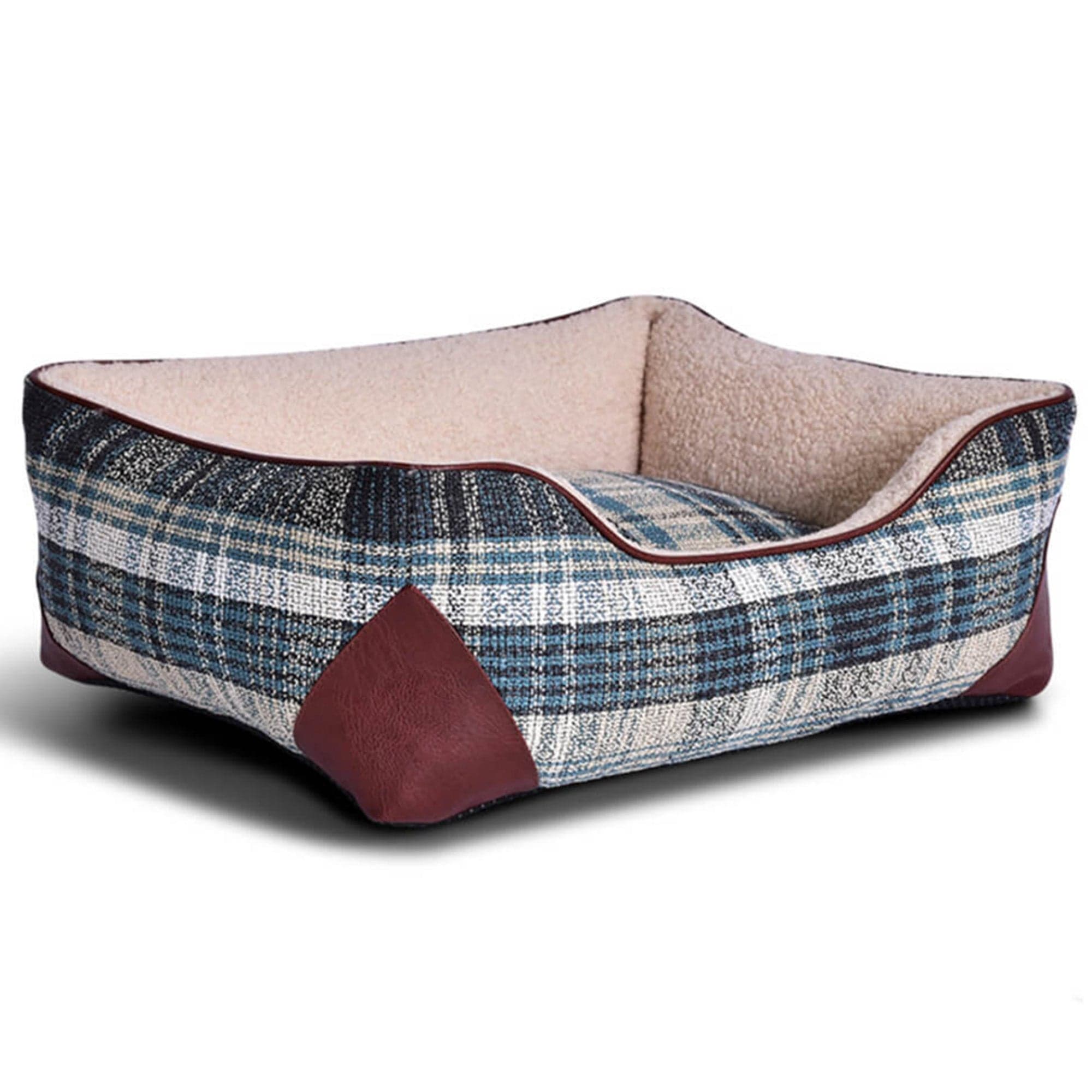 Slashop Square Vintage Plaid Faux Sherpa PU Leather Dog & Cat Bed - Blue