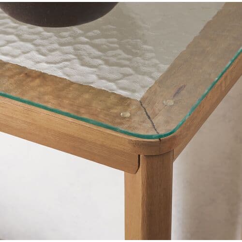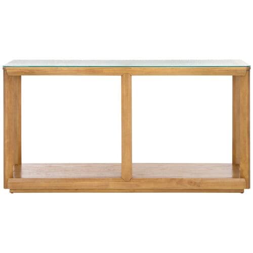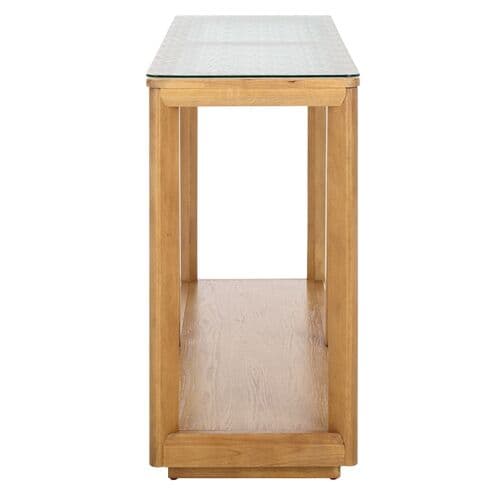 The Quoril Glass Top Console Table Combines Timeless Elegance with practical functionality. Crafted from solid rubber wood, its robust construction is complemented by a clear glass tabletop that highlights the wood’s natural grain. Ideal for any décor, this versatile table offers both stylish display space and convenient storage for books, décor, or baskets. A perfect blend of form and function, it adds sophistication and durability to any room.