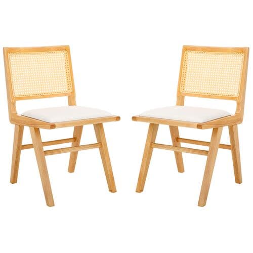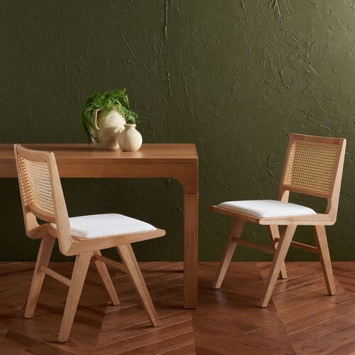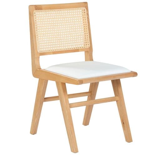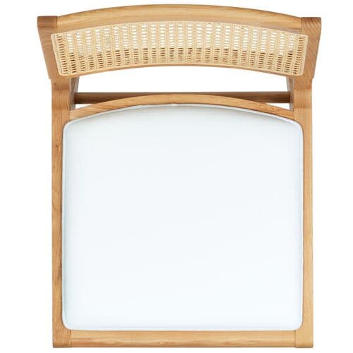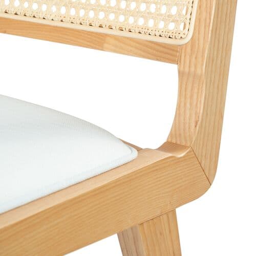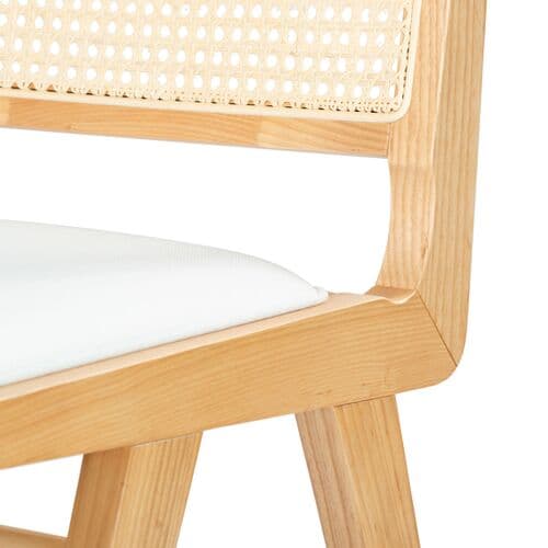 Embrace the chic appeal and easy comfort of our Rafe cushioned dining chair. The clean and crisp geometry of the chair meets the warmth of a natural cane to attain a relaxed and sophisticated presence. A stunning French cane weave upon the backrest elevates the airy appeal and elegance of our chair. Its cane back is beautifully grounded with an ash wood frame and angular legs. A perfect fit for both your casual and formal meals, our dining chair brings comfort and breezy charm to your kitchen, dining, or living space.