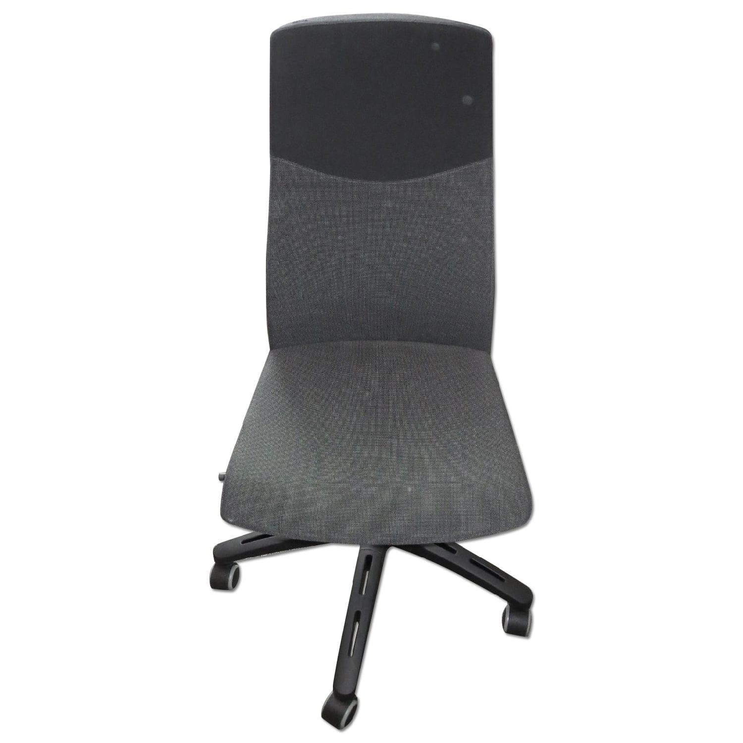 Adjustable seat height and depth, lumbar back support, high back, sits on 5 wheels, no wear and tear or stains/rips. In excellent condition. Regularly maintained with fabric cleaner. Bought new. Used for 1 year.