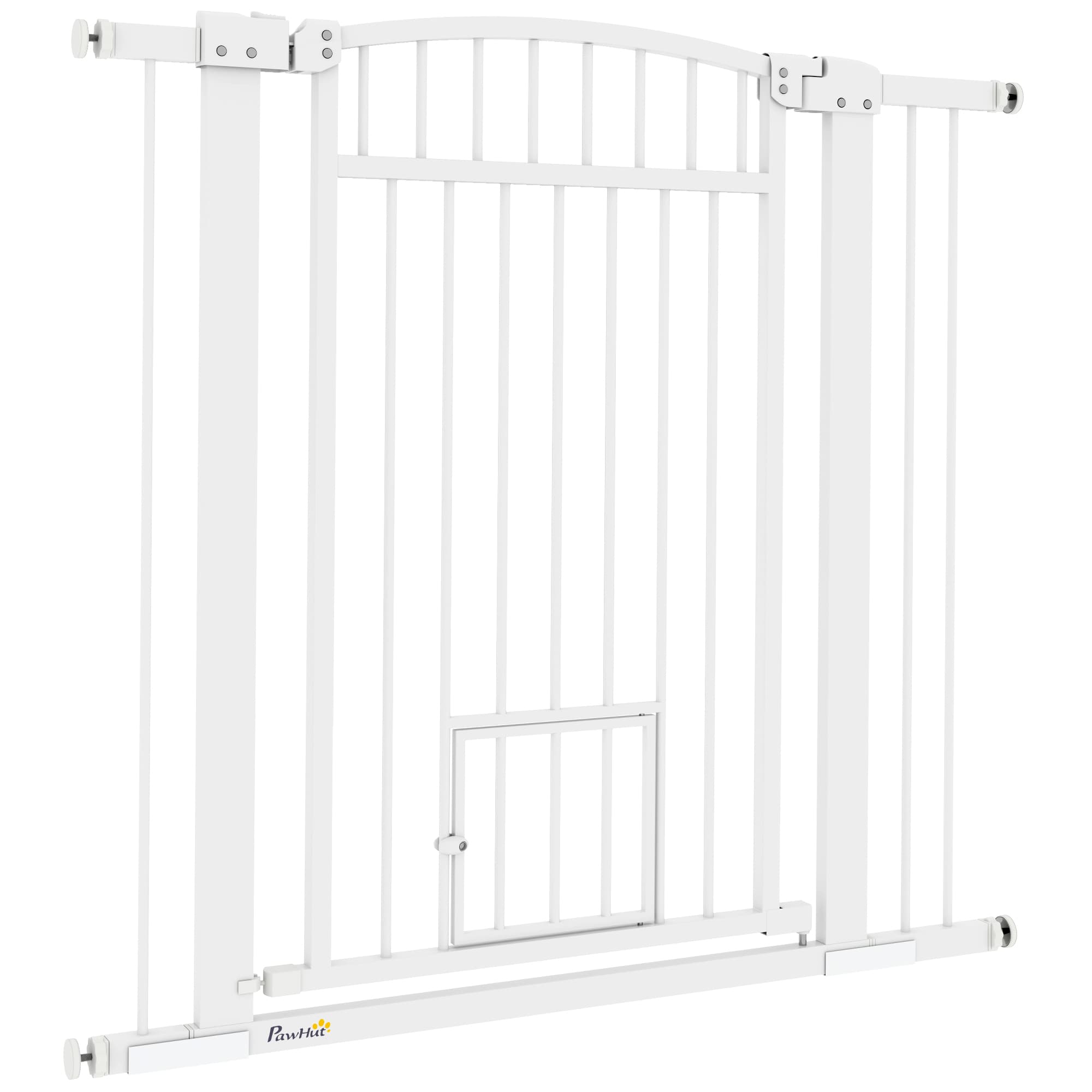 Discover the PawHut pet gate, a sleek 37.4" high barrier that adjusts between 29.9" and 40.9" to fit your space. It features a convenient double-locking system and effortless single-handed use. Also, it includes a handy cat door that's great for keeping dogs in check while letting smaller pets roam freely. Suitable for stairways, hallways, and doorways this stylish and functional gate is great for every pet-loving home.
