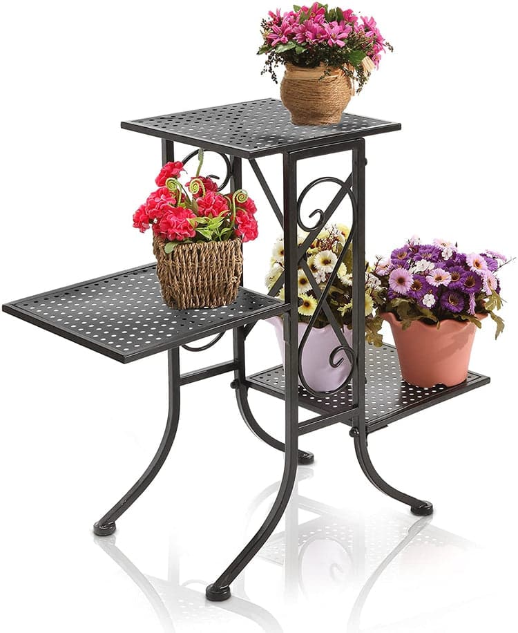 This elegant and sturdy planter rack is the perfect decorative accent for your home, deck, or patio. Featuring 3 sturdy shelves made of perforated metal, this decorative display rack offers plenty of display space for flower pots, picture frames, cherished keepsakes, and more. Scrollwork accents decorate the sides of the stand to add a touch of flair, and the freestanding design of this shelf rack provides you with the perfect upright organizer for any room.With this memorable and classy display stand, you can bring a new sense of elegance and style to your home.Product Features:Ideal to show off plants, picture frames, patio decorations, and moreMinimum assembly requiredAdd elegance to your home decor with this lightweight metal display stand that features a black sleek finish and stylish scrollwork accentsThe stand includes 3 perforated metal shelves on 3 different levels for a nice visual effectDimensions (in inches): 26 W x 22.75 H x 10.25 D