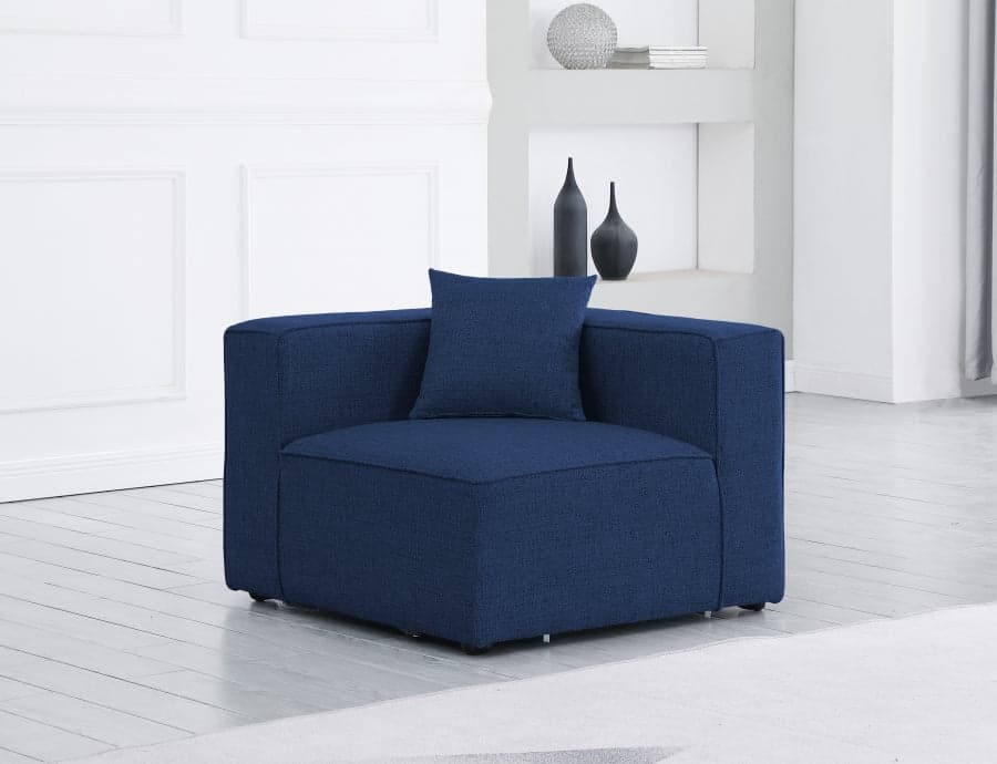Description Treat yourself to some long overdue "me time" when you're seated on this Cube Modular Corner Chair. This beautiful modular unit is both eye-catching and elegant, features durable linen textured upholstery in a soft navy color that meshes well with nearly any existing color scheme. Pair this modular Corner Chair with other items in the same collection to create an unlimited number of combinations and enjoy the custom seating arrangement of your dreams. Latches underneath make it easy to attach pieces to one another.