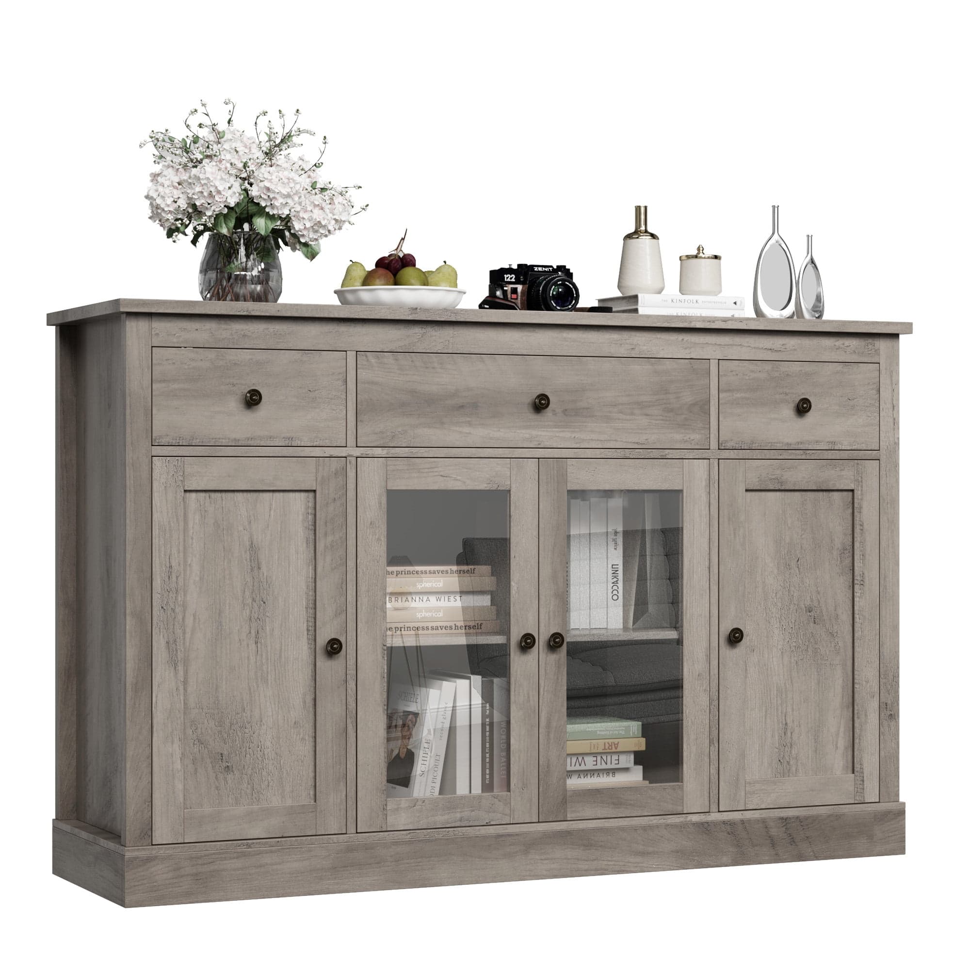 Homfa - Create a comfortable life! This Homfa kitchen buffet cabinet with 3 drawers and a 4 door cabinet interior shelf with adjustable board, which is and made of sturdy board, will meet your different storage needs perfectly, especially in your living room, kitchen, and coffee bar as your nice storage assistant. Accompanied with premium metal round handles and clean lines, this modern farmhouse kitchen buffet cabinet with drawer will do a good job in matching your various decor style, meanwhile the glass cabinet doors could be organized in 2 ways, bringing you more joy in house decor.