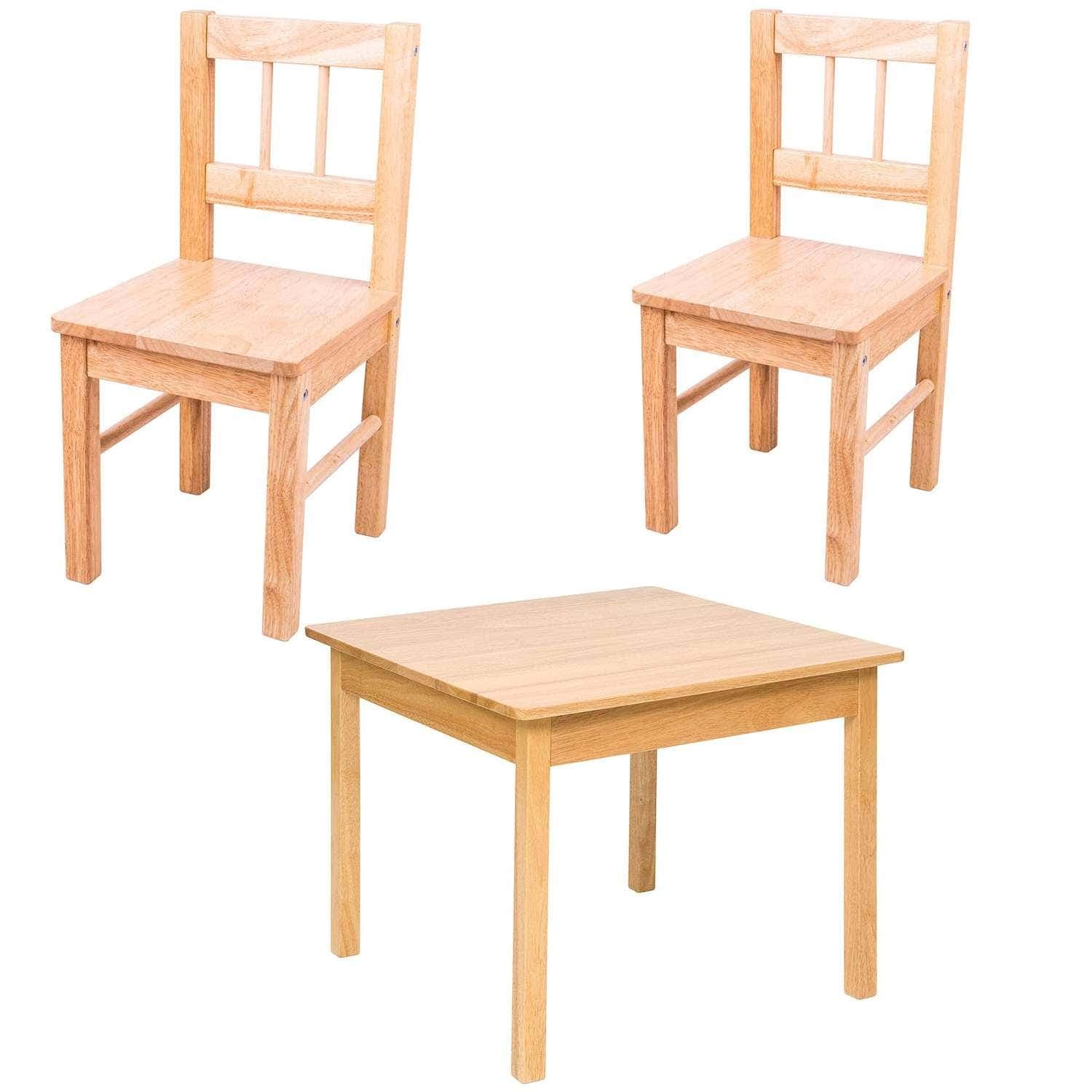 This high quality Wooden Table, is supplied with 2 sturdy wooden chairs, perfectly sized for little ones to perch on, is the perfect addition to any playroom or learning environment. Constructed from solid wood. Set requires adult assemble. Made from high quality, responsibly sourced materials. Conforms to current European safety standards. Chair colour options: natural, blue, red, green and yellow.H- 56.59 W- 29 D- 27cm (Chair Size)H- 51 W- 60.5 D- 60.5cm (Table Size)Age 3+ years.