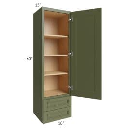 Width 18" | Height 60" | Depth 15" Wall cabinet with (2) 5-7/8" drawers on bottom and 1 door on top. There will be 3 adjustable shelves on the top of the cabinet. The frame will be flush with the side panel and both sides will be finished. Note this cabinet has a 15" depth