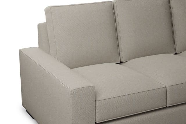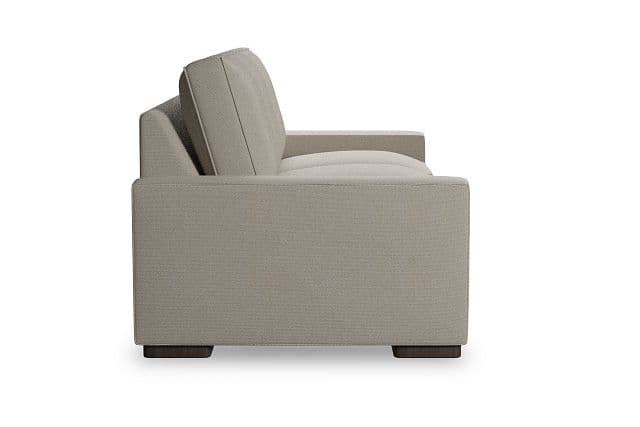 Enjoy custom style with superior value and fast delivery. Our Edgewater collection is available in over 50 fabrics, with a versatile base that can go in any style direction. The exclusive design is made in America at our Kevin Charles factory, using down-blend cushions and a reinforced frame with padded sides and backing for superior comfort and quality. Shown here upholstered in our Peyton beige fabric, a polyester LiveSmart fabric made with performance technology that is moisture repellant, stain resistant, and designed for heavy-duty wear.