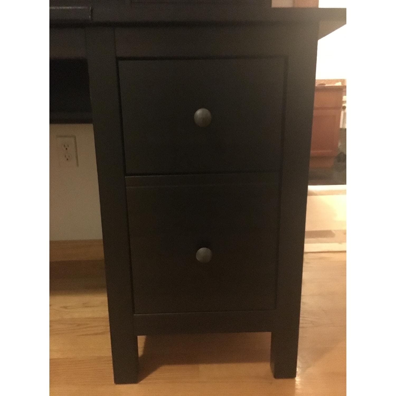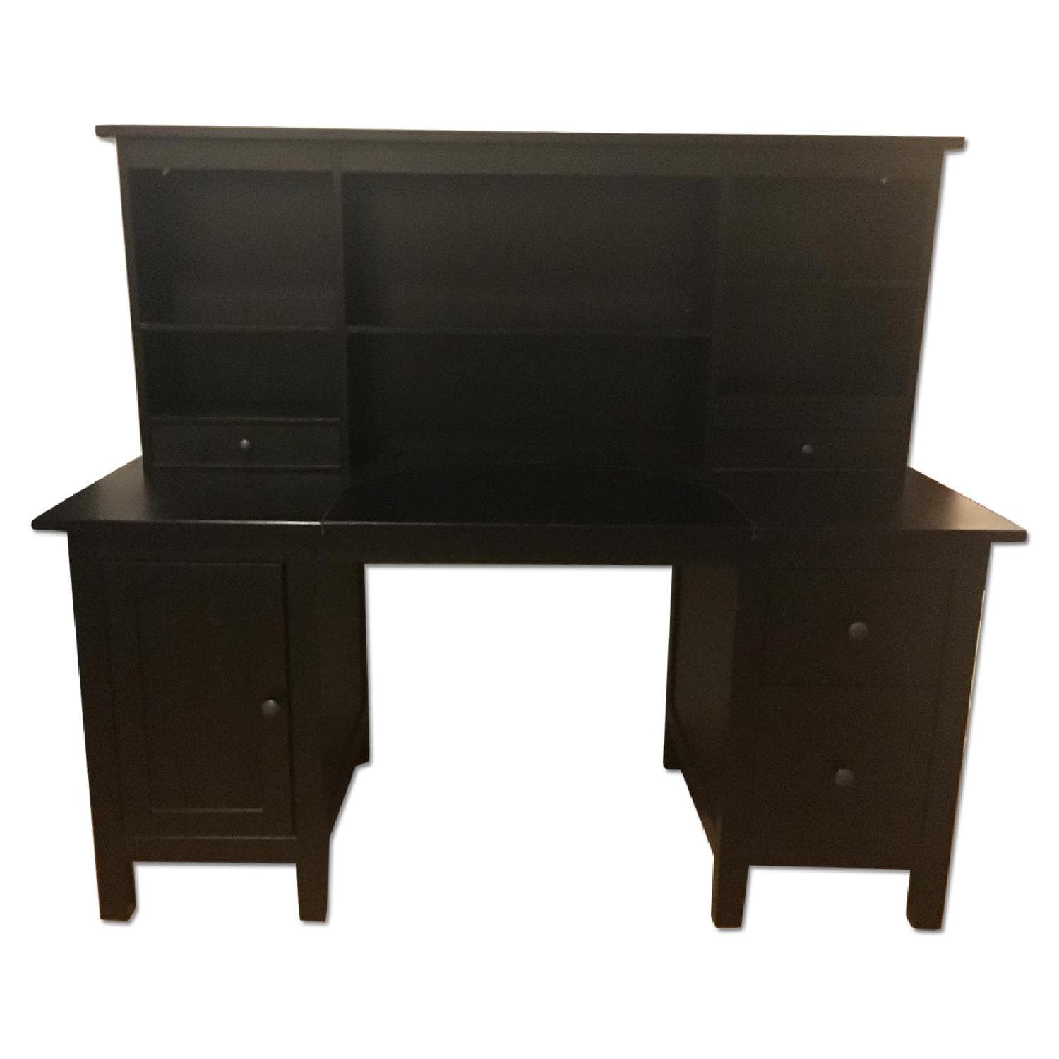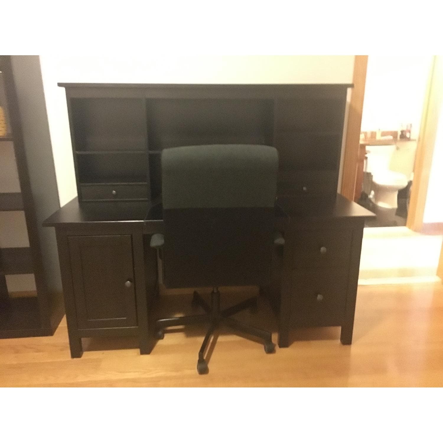 • This is an Ikea Hemnes desk and hutch in black-brown and a Malkom desk chair in grey cotton fabric being sold as a group item.