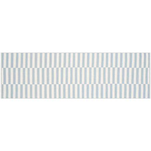 Ideal for diverse decors, this rug is crafted from cotton with a unique stripe pattern in ivory and light blue. Using a rug pad is suggested to prolong its lifespan and ensure it stays in place.