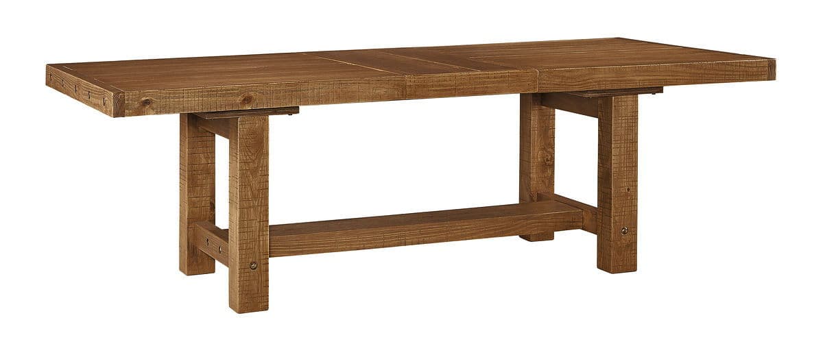 Indulge the senses with this simply striking dining room extension table in a light and natural honey-tone hue. With its thick slab tabletop, blocky legs and supportive trestle base, its highly clean-lined style meets heavy-duty substance. Extension leafs ?against-the-grain� finish incorporates a cool contrast. Saw-marked table edges with exposed bolt head accents add an industrial punch.Product Features Made of veneers, wood and engineered wood Natural honey-tone finish Plank-style tabletop with heavily distressed edges Bolt head accents Separate extension leaf Table extends by pulling both ends and dropping in leaf Seats up to 6 Item Features ["Made of veneers, wood and engineered wood","Natural honey-tone finish","Plank-style tabletop with heavily distressed edges","Bolt head accents","Separate extension leaf","Table extends by pulling both ends and dropping in leaf","Seats up to 6"]