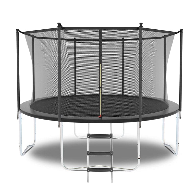 Exercise and keep fit the fun way with our SafeBounce 12 Ft Trampoline with High-Density Net. Designed for safety and fun, our 12 ft trampoline improves cardiovascular health, build strength, and boost flexibility. With safety being a topmost priority, our play space incorporates innovative designs and devices that offer twice as-needed safety. These include a tightly attached jump pad and spring cover to prevent foot entrapment and a foam sleeve to cushion frame impacts. It also includes a patterned plastic ladder for secure climbing. Additionally, our kid-friendly 12 ft trampoline boasts a wear-resistant trampoline jumping mat and thickened rust-proof steel material. Its maximum weight capacity of 400lbs offers a comfortable jumping experience. This trampoline also has sturdy galvanized springs for a comfortable bounce. With a tightly woven jumping mat for added safety, and 4 sturdy U-shaped legs with 8 balanced contact points for stability. Provide a fun way for you and your kids to enjoy physical activity, play games, and experience the thrill of bouncing high. Order our 12 ft trampoline now and create unforgettable memories! Specification Product Type: Trampoline Product Use: Backyard Play Color: Grey Weight (lbs): 130.07 Weight Capacity: 400lbs Assembly: Easy Assembly Required