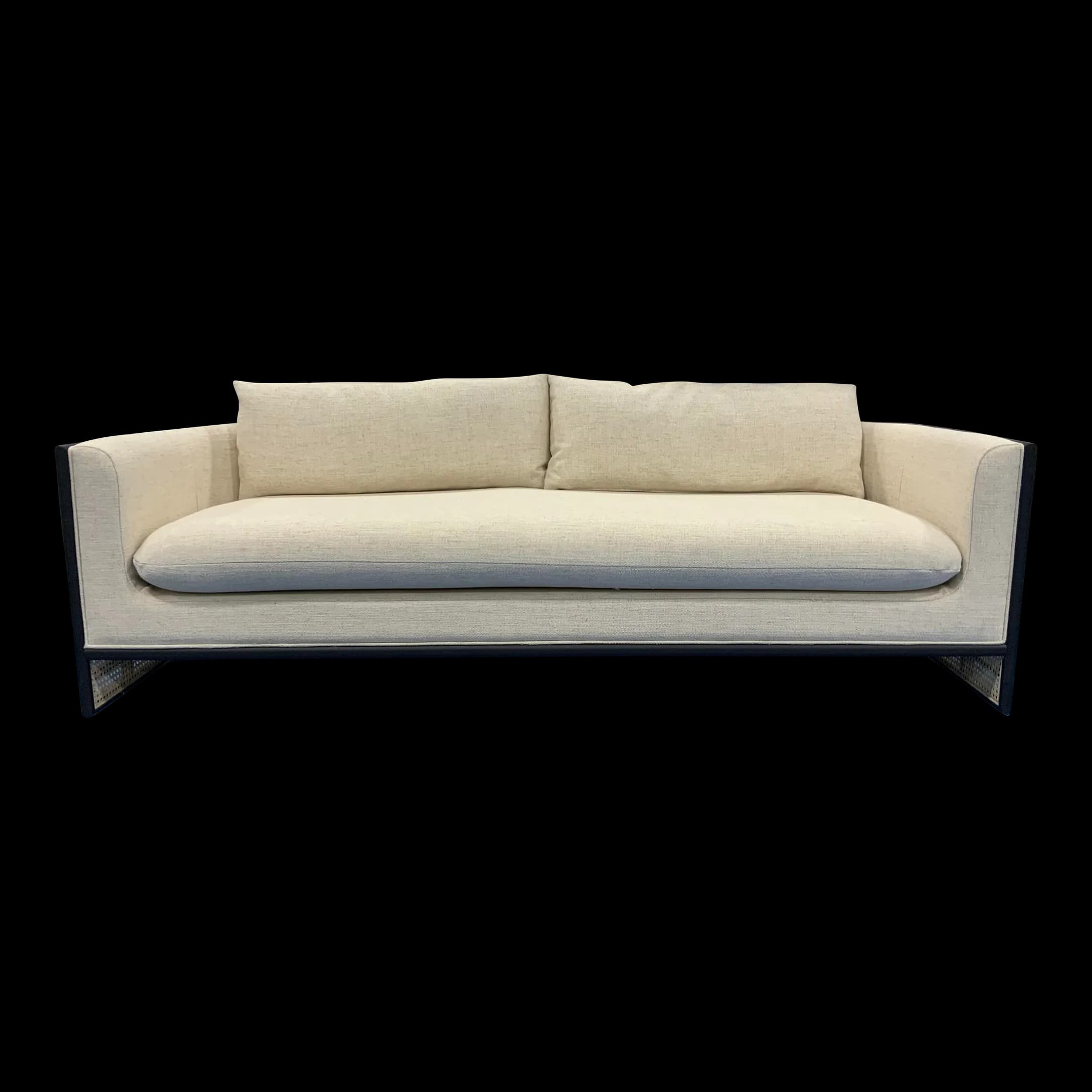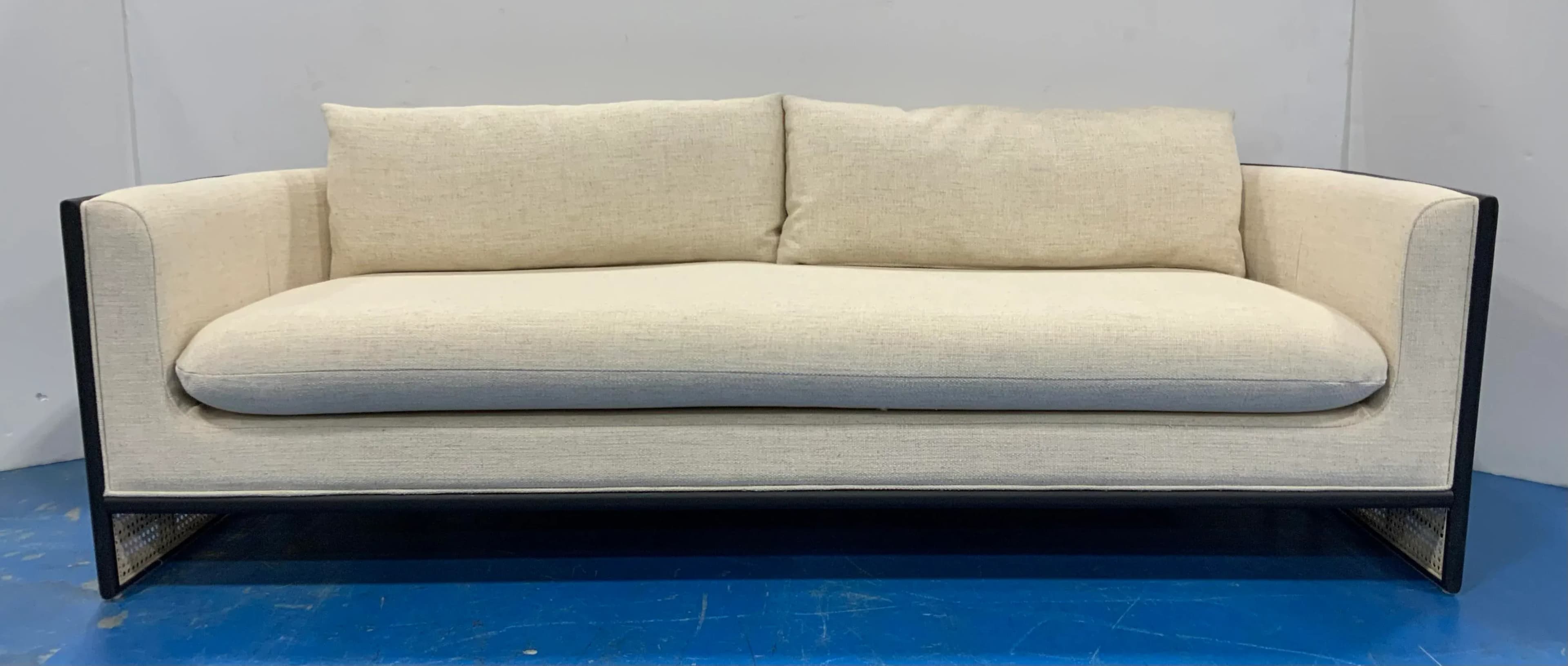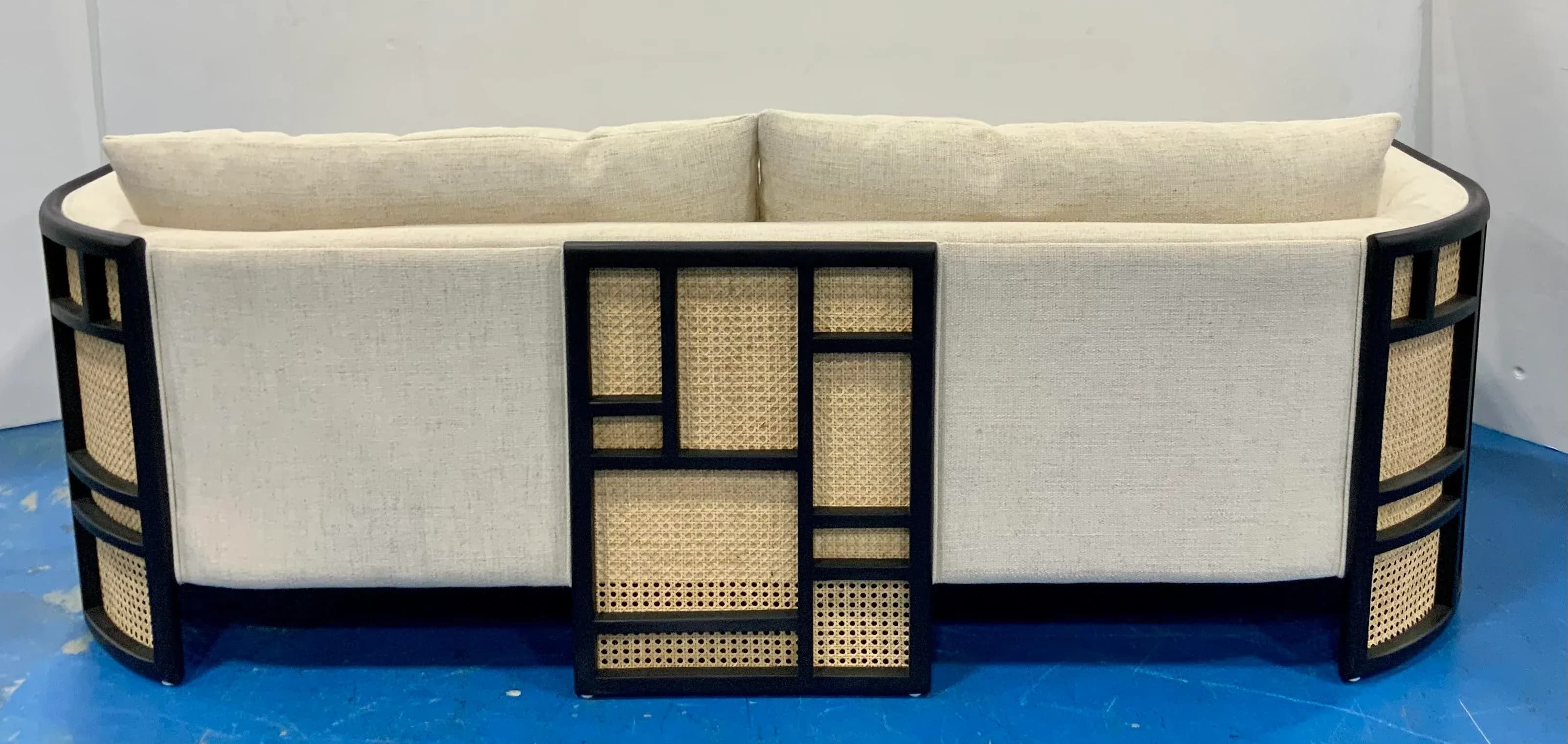 Stylish Modern Linen Cane and Wood Sofa, black wood frame with caning accents, linen blend upholstery, showroom floor sample ,