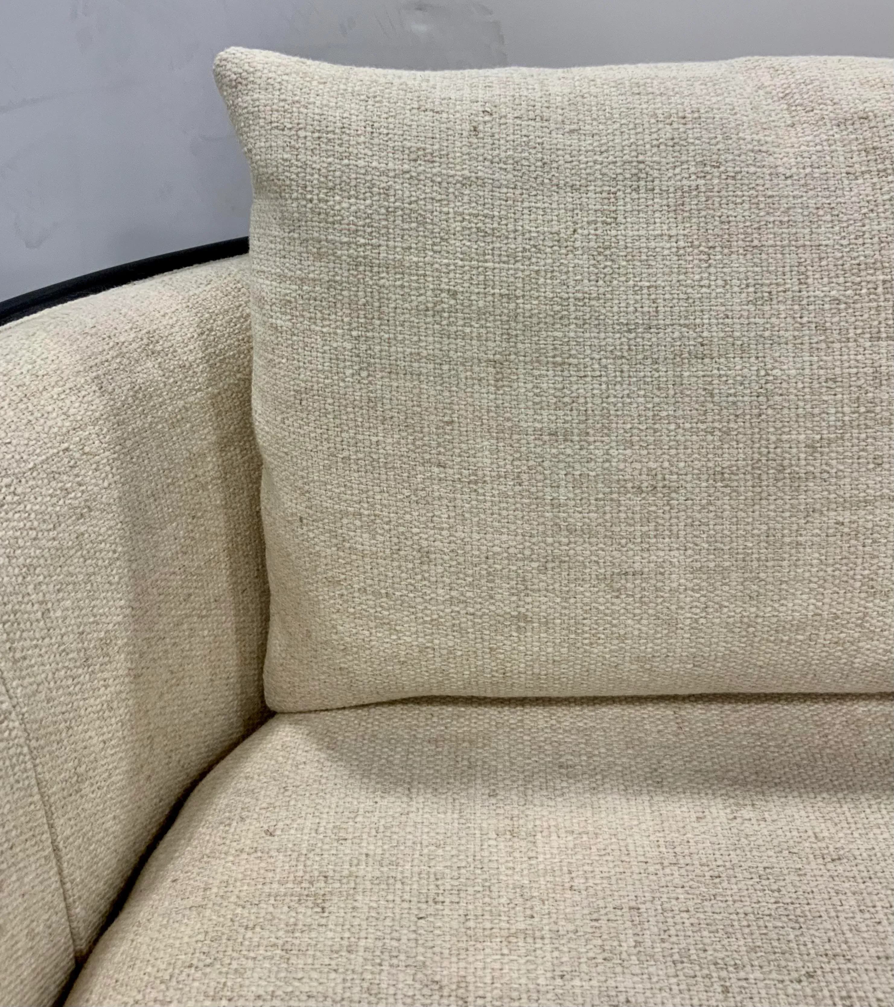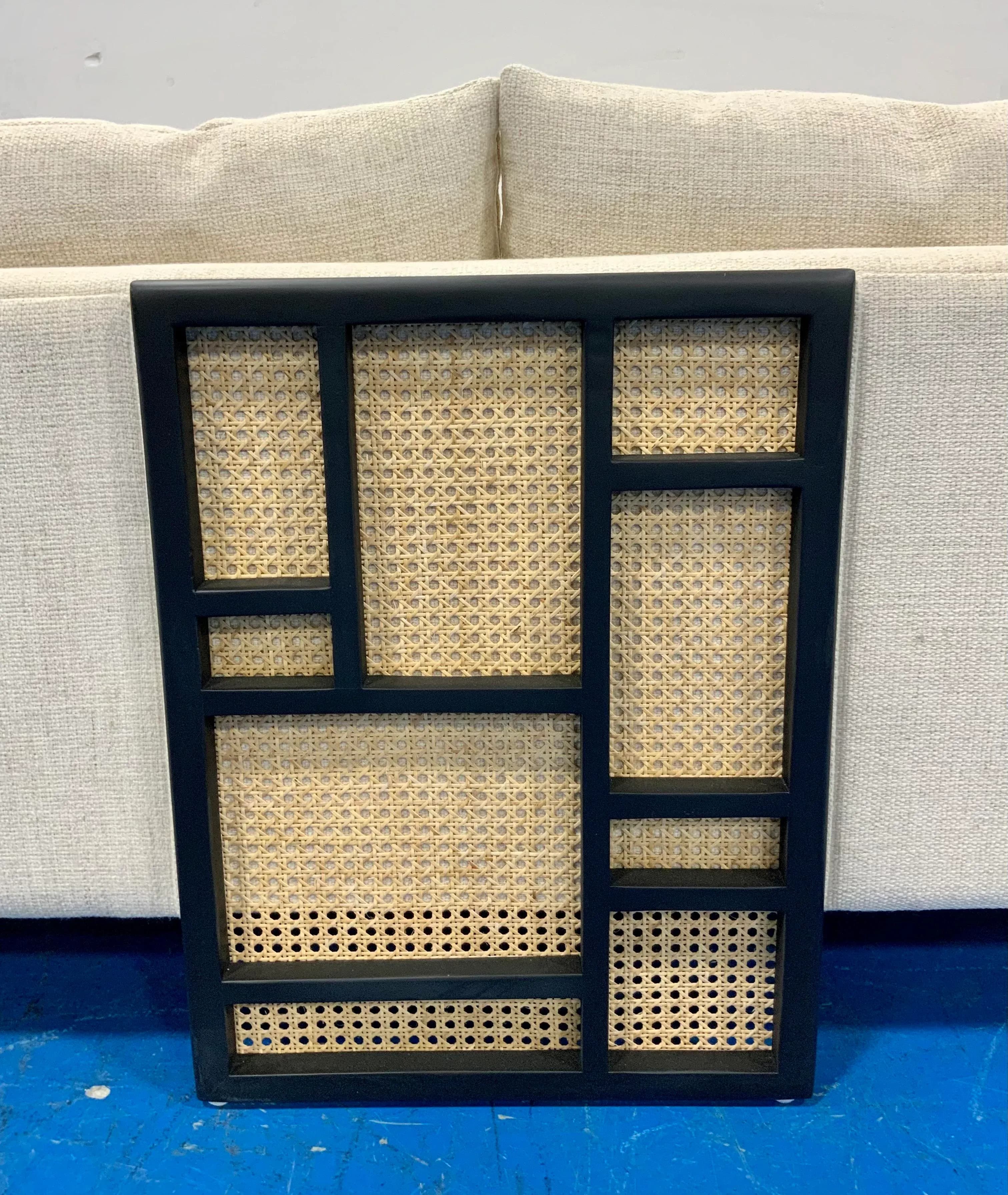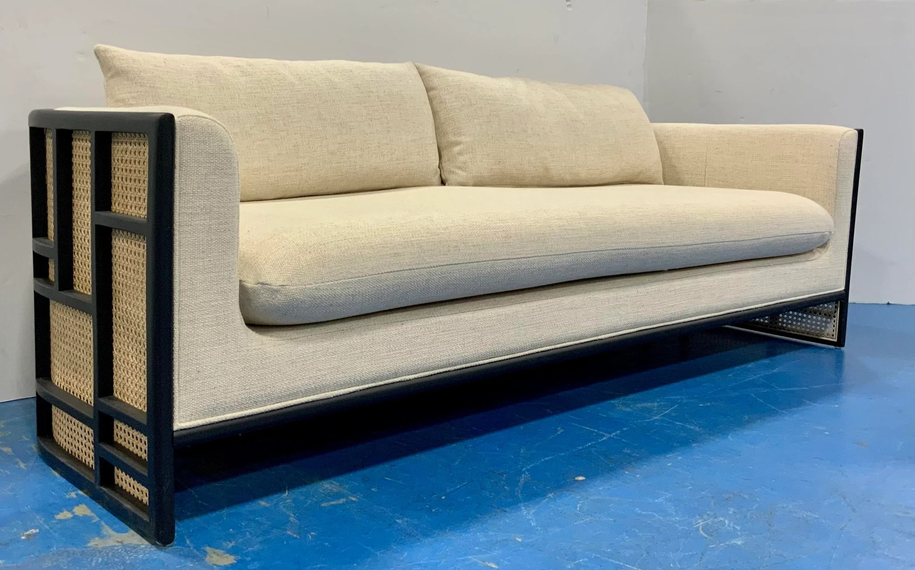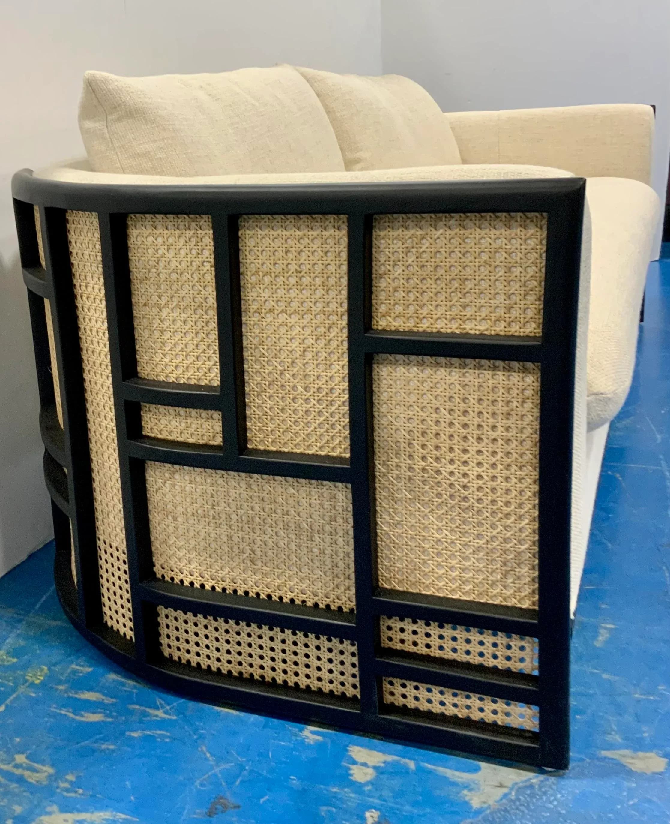 Stylish Modern Linen Cane and Wood Sofa, black wood frame with caning accents, linen blend upholstery, showroom floor sample ,
