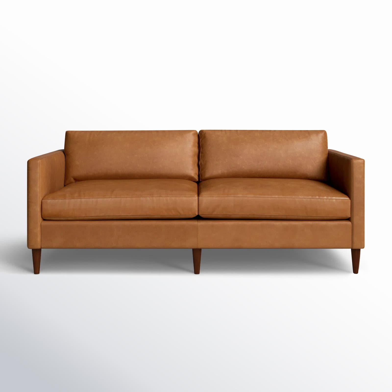 Inspired by mid-century + Scandi styles, this shelter-arm sofa displays clean lines + wooden cone legs. This AllModern exclusive design is artisan-built in North Carolina, with feather-blend cushions supported by steel sinuous springs. Choose from a range of leather upholstery options to design your ideal seating – it’s modern made custom.