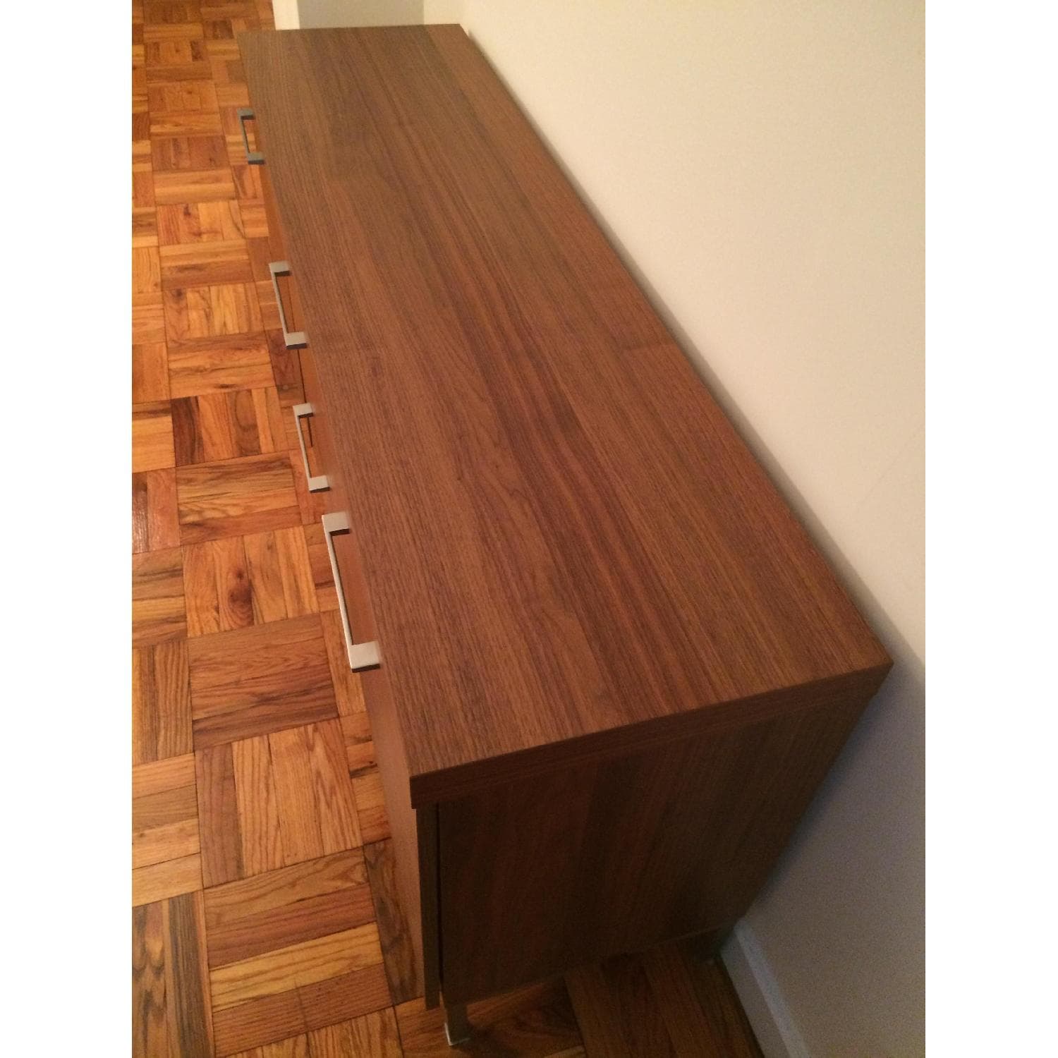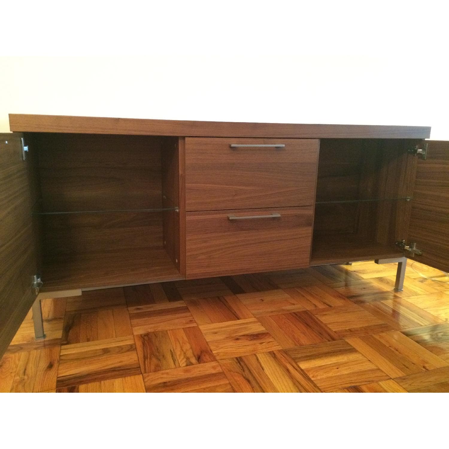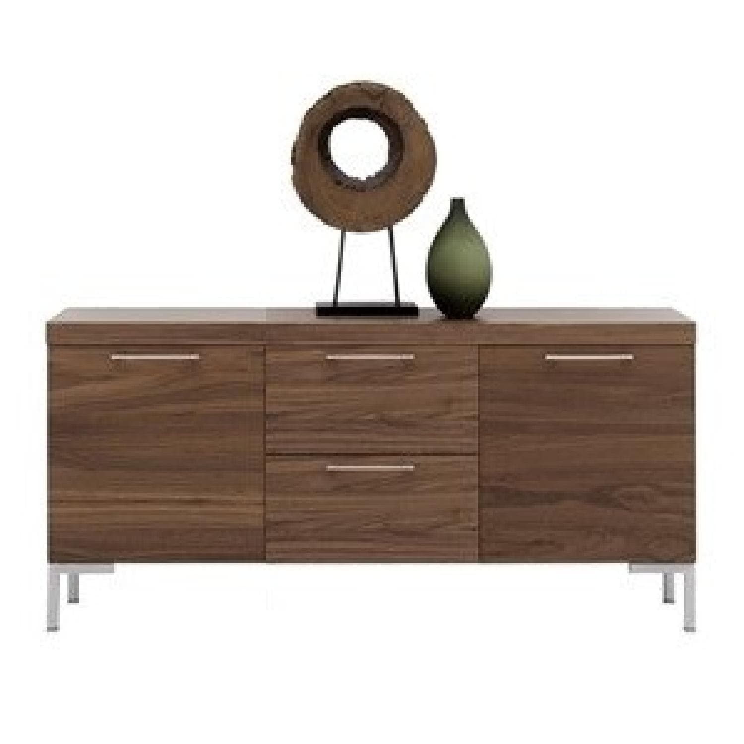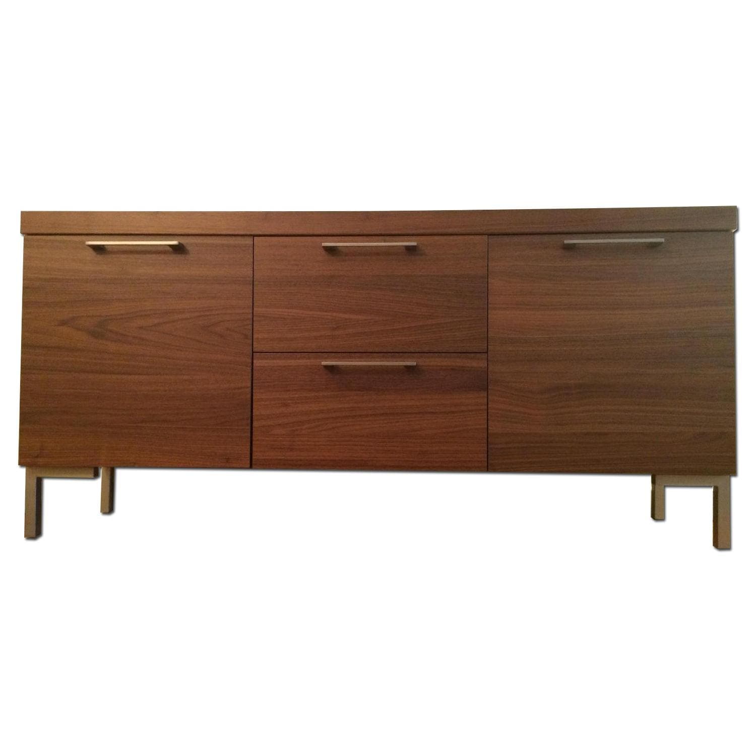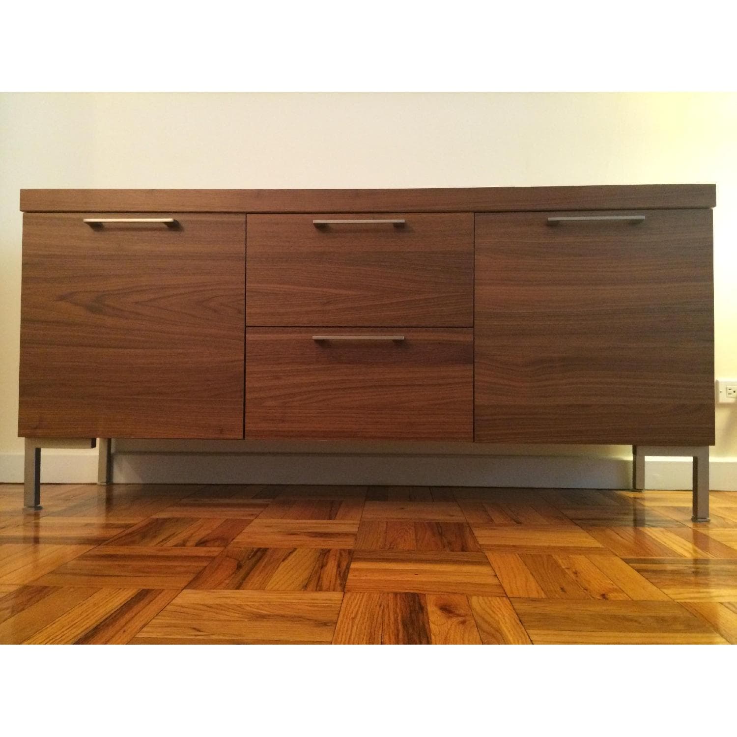 This is a BoConcept Bari Sideboard mainly made of particle board in walnut veneer/brushed steel. It is in perfect condition (clean, no stains, no damages) and it has a lot of storage space. The actual dimension is H28¾xW60¾xD16½". I'm moving abroad and need to sell my furniture by May.
