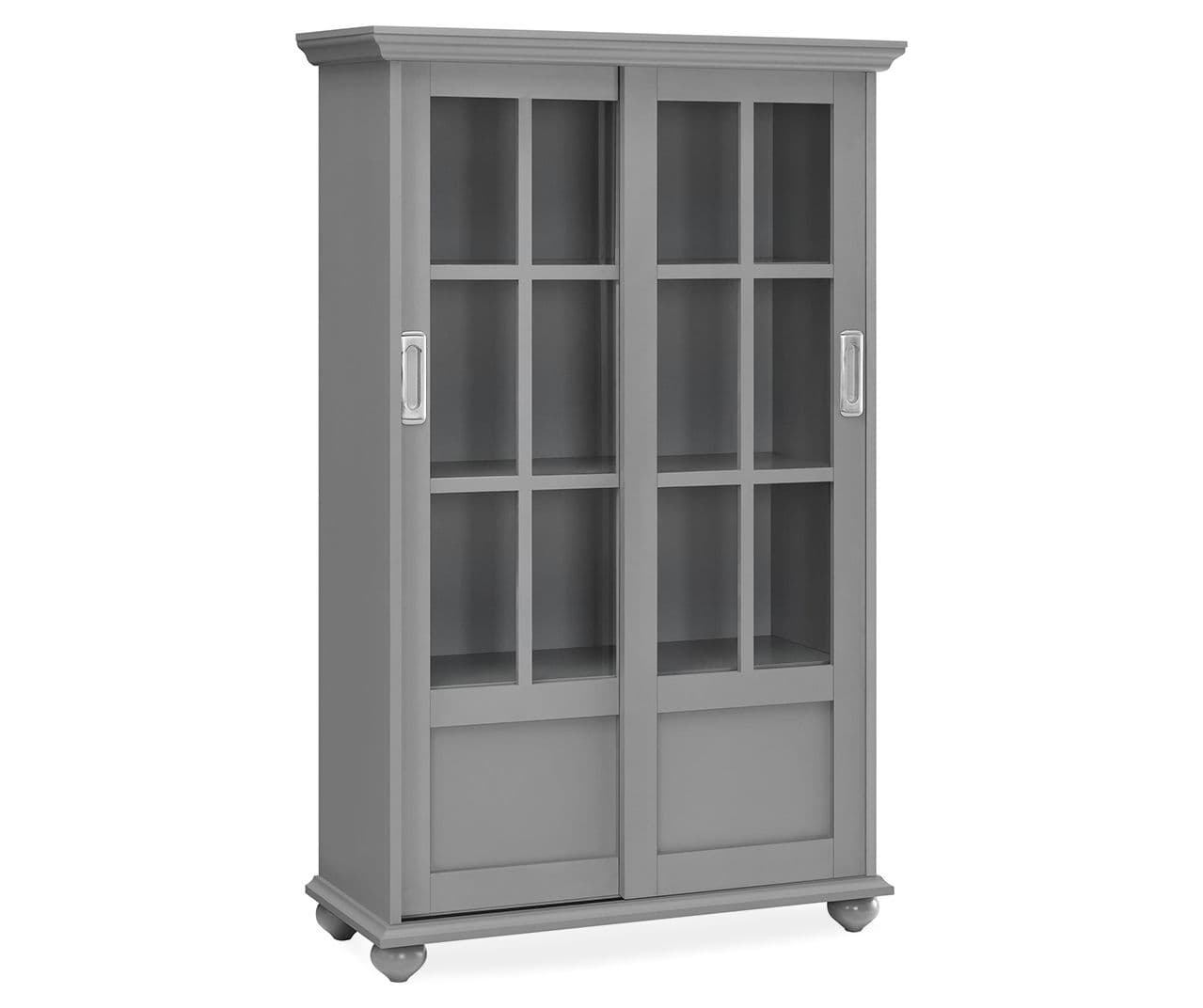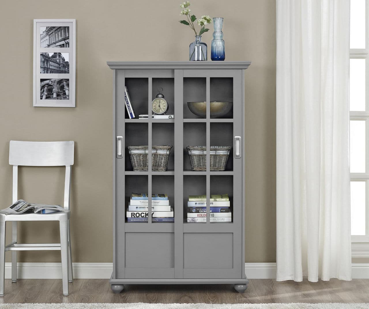 Storage made beautiful. This charming bookcase from Ameriwood in a neutral gray finish pairs perfectly with endless styles and décors. Constructed with four shelves behind two sliding glass doors, delivering convenient storage to any space. Ideal for books, decorations, china and more, this charming bookcase adds an elegant display to your study, dining room or living area.