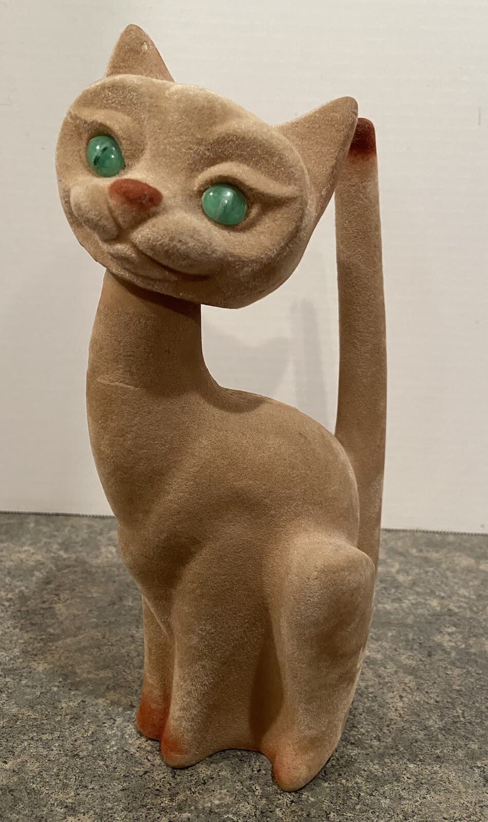 Vintage Flocked Tan Cat Coin Bank Green Eyes Bobble Head 9” Tall VGC