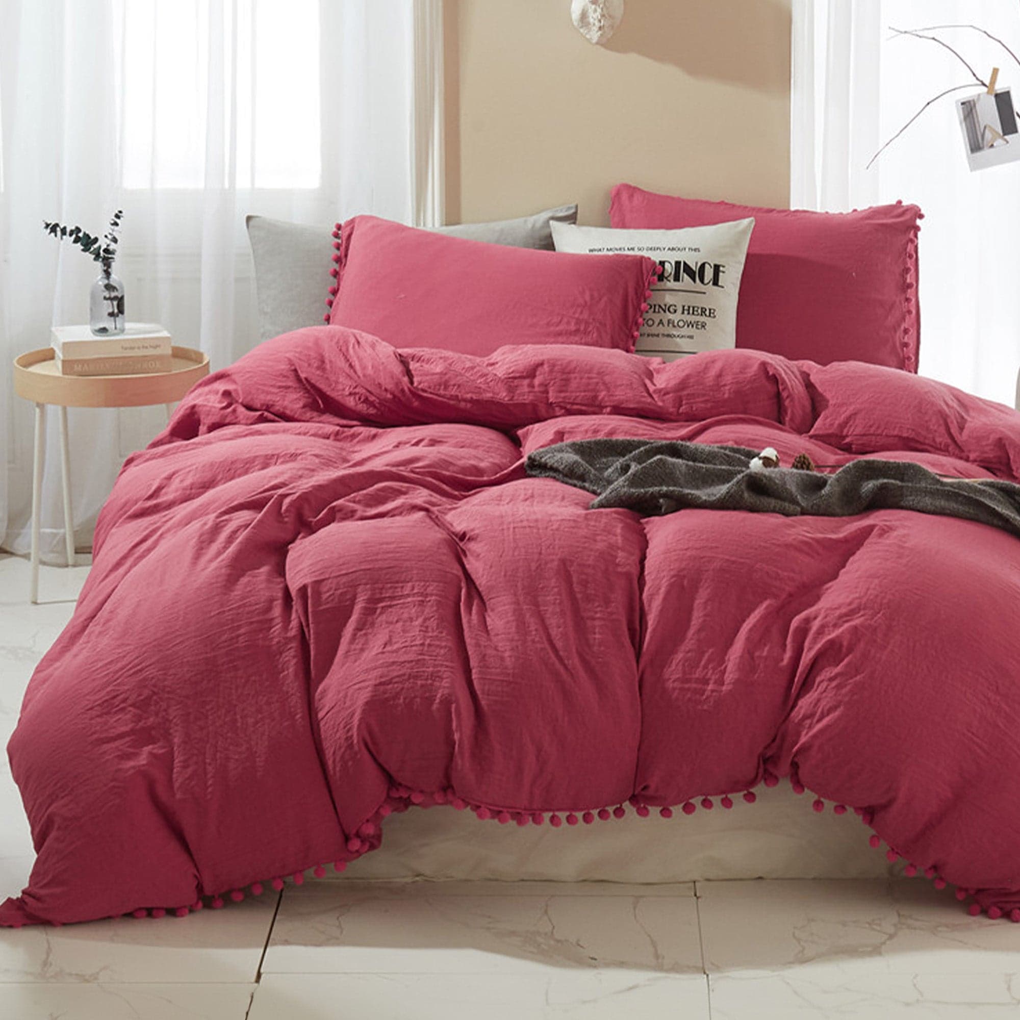 Slashop Soft Touch Pom Pom Fringe Duvet Cover Set Soft Chic Bedding with Playful Details - Elegant Rosewood