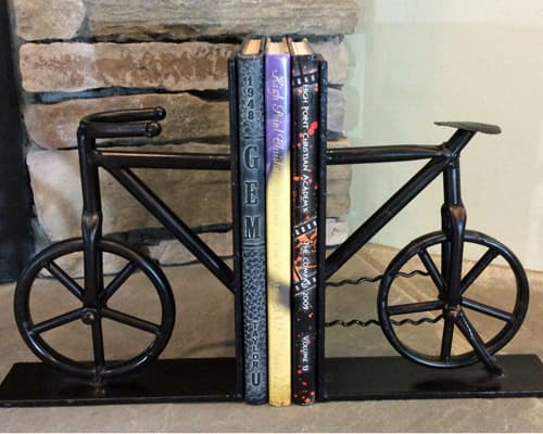 Need some highly functional, fun bookends for a cycling fan? Try our newest set of heavy duty, bicycle design bookends in a black industrial finish. These bookends feature a classic bicycle design with artistic chain. *Heavy duty metal construction *Functional with high sides *Black industrial finish *Dimensions for each half: 10 3/4" High x 2 3/8" Deep x 7 3/4" Wide (x 2 pieces- total 15 1/2" across for the set of bookends)