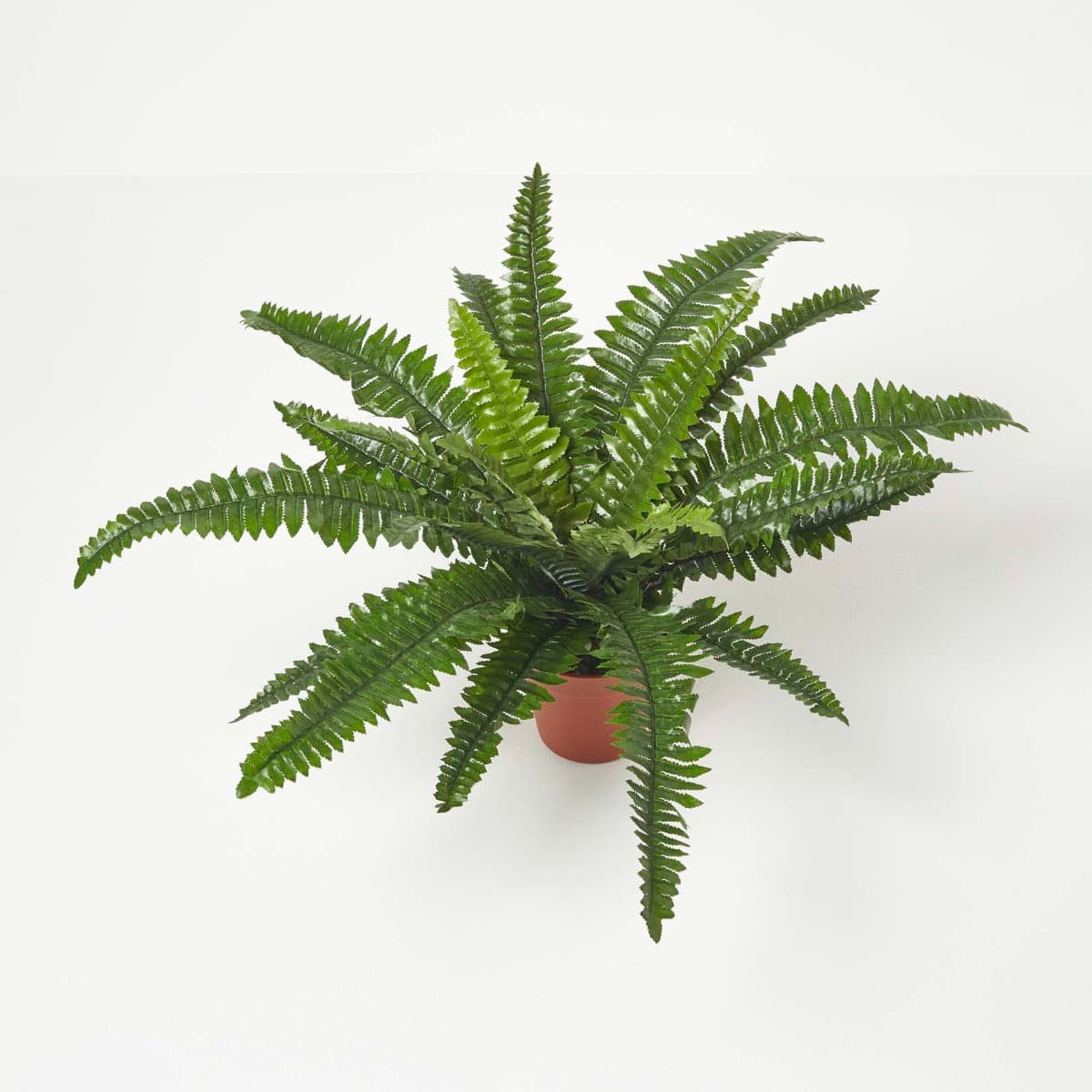 Small green artificial fern plant, lifelike green fake house plant measuring 45 cm tall, colourful UV protected decorative faux Boston fern in pot.