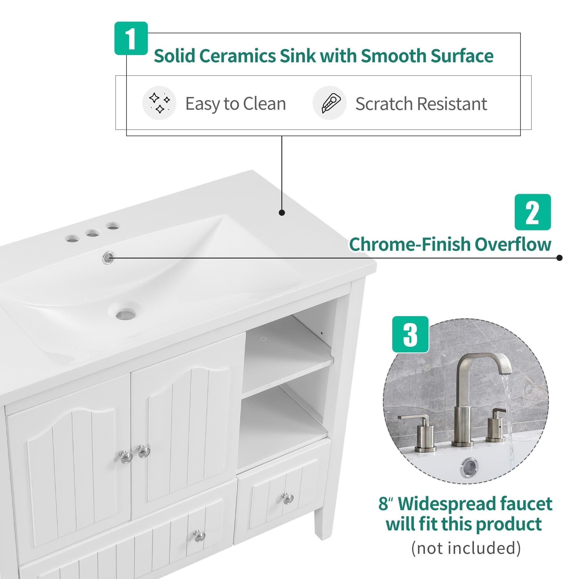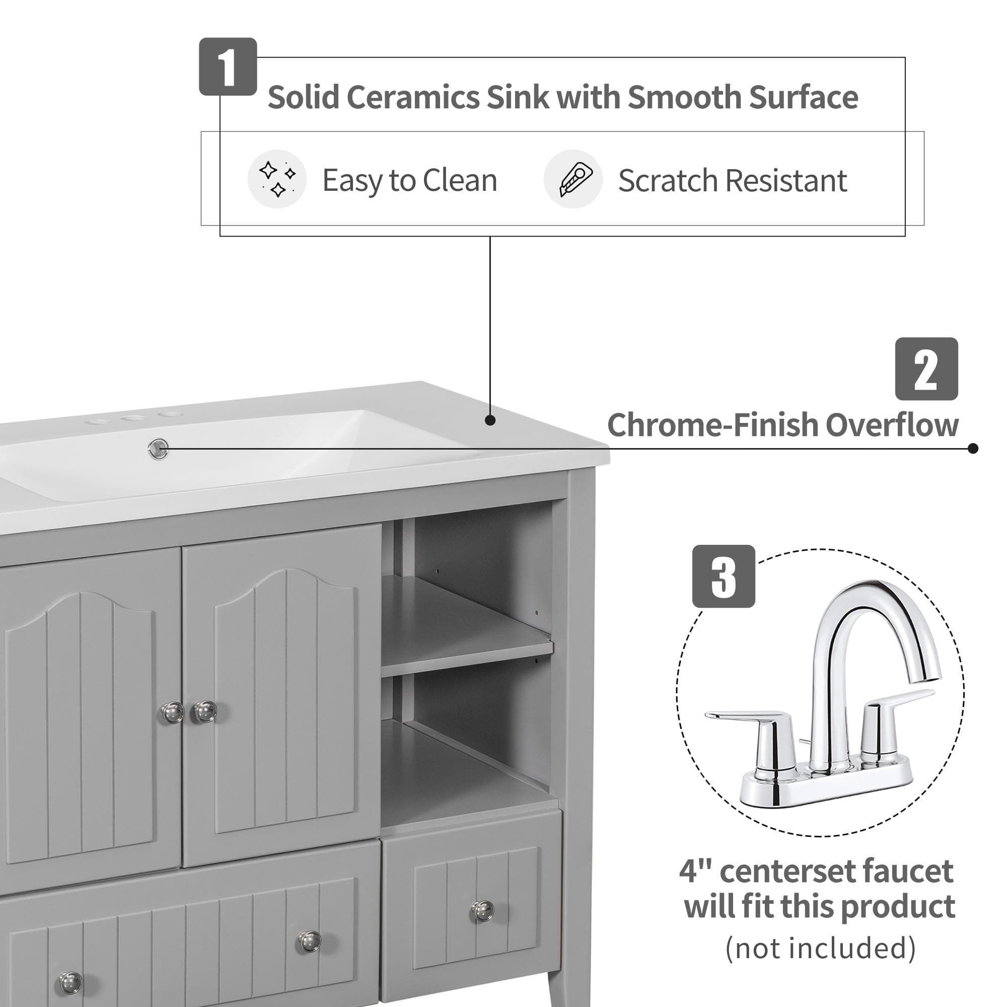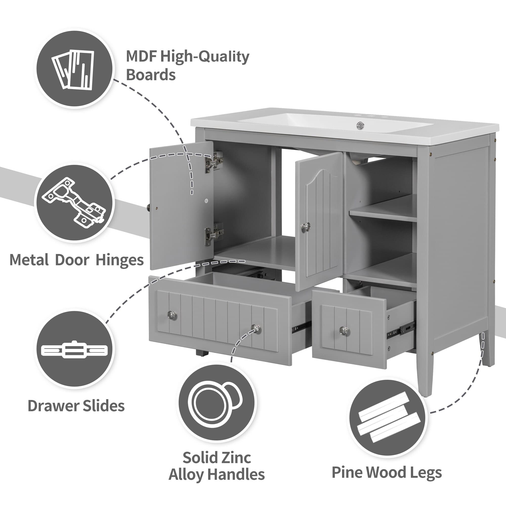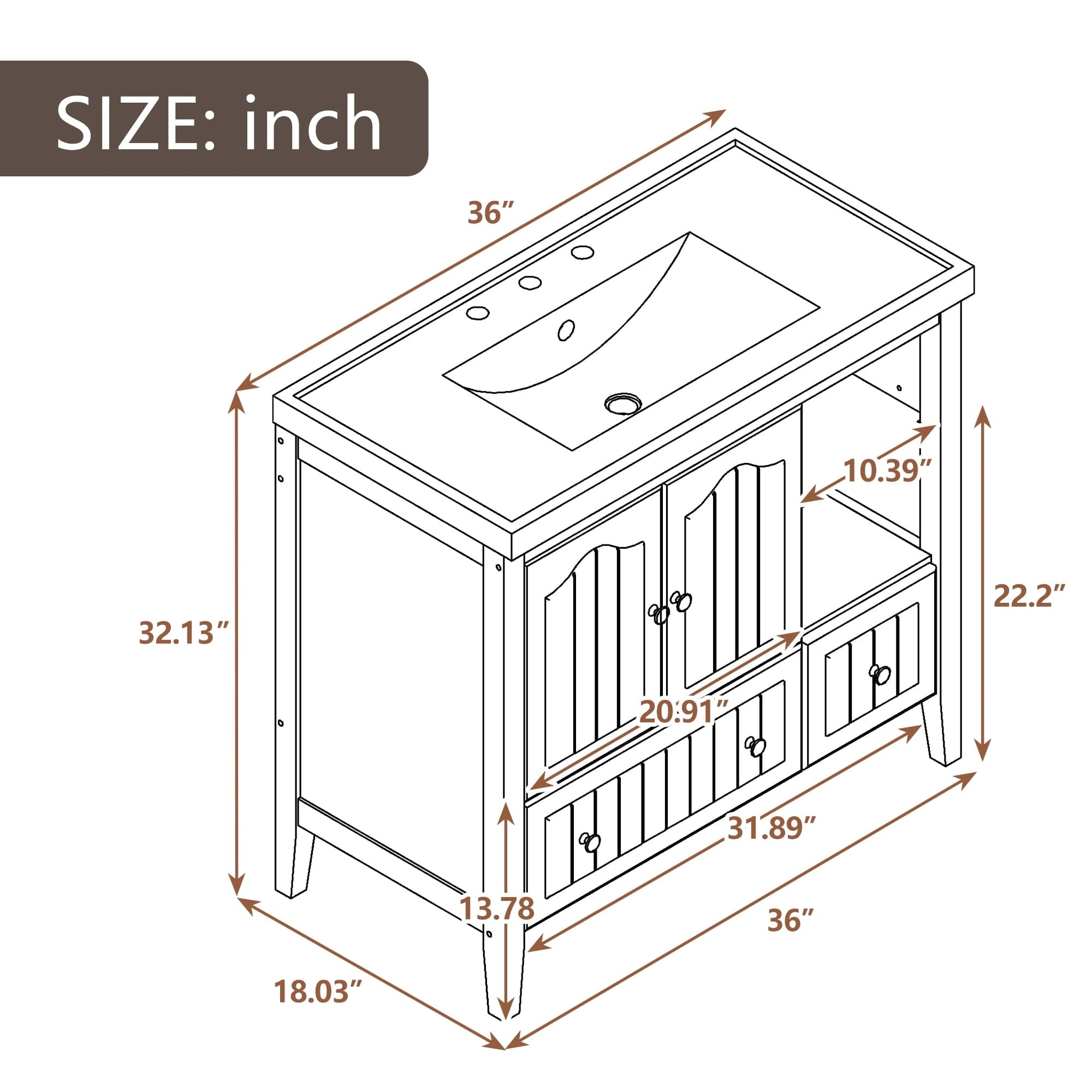 Specification: Color:White/Grey Material: Solid Pine Wood + MDF Board + Ceramic Overall Product: 36.00"L x 18.03"W x 32.13"H Weight: 99.2lbs Sink Top: 36.00"L x 18.03"W x 6.61"H Sink Top Weight: 41.88lbs Cabinet Base: 35.04"L x 17.52"W x 31.02"H Cabinet Base Weight: 57.32lbs Description: Transform your bathroom with this stylish 36" Bathroom Vanity featuring a durable ceramic basin. Designed for optimal organization, this vanity includes two spacious doors and drawers for ample storage of your bathroom essentials. The solid frame ensures longevity, while the sleek metal handles add a modern touch. Perfect for both functionality and aesthetic appeal, this vanity is an excellent addition to any bathroom. Key Features: Stylish & Functional: This 36" vanity features a contemporary design with a sleek ceramic basin, perfect for the look of any bathroom. Ample Storage: Equipped with two doors and multiple drawers, providing organized storage for toiletries, towels, and other essentials while keeping your space clutter-free. Durable Construction: Crafted from high-quality materials, ensuring long-lasting durability and resistance to daily wear and tear. Easy to Clean: The smooth ceramic basin and cabinet surfaces are easy to maintain, allowing for quick cleaning and upkeep. Versatile Design: Ideal for both modern and traditional bathrooms, adding a touch of and functionality to your decor. Easy Installation: Designed for hassle-free setup, making it simple to upgrade your bathroom with this stylish vanity.
