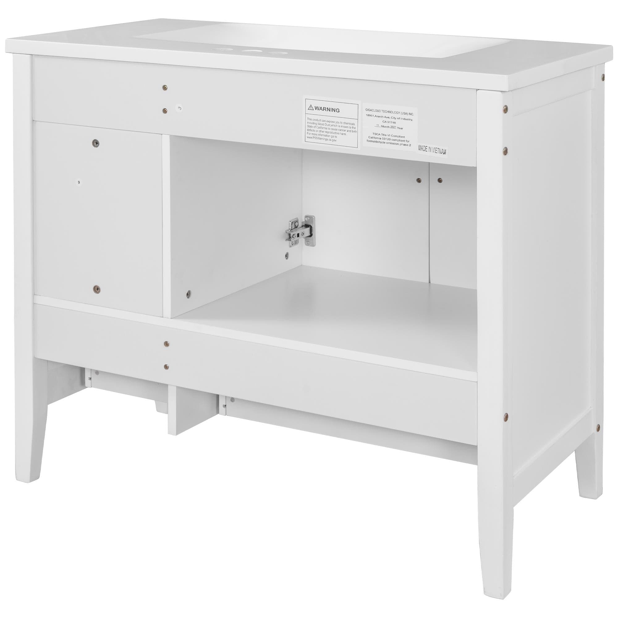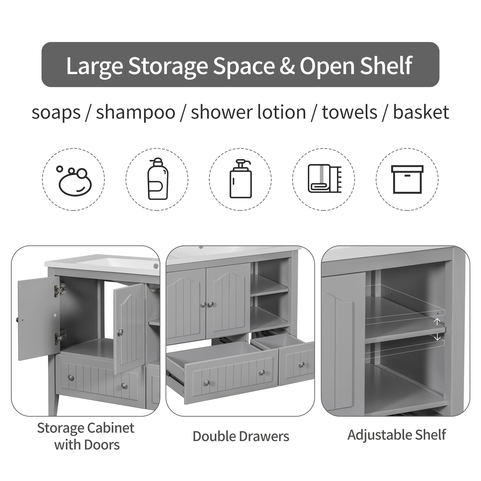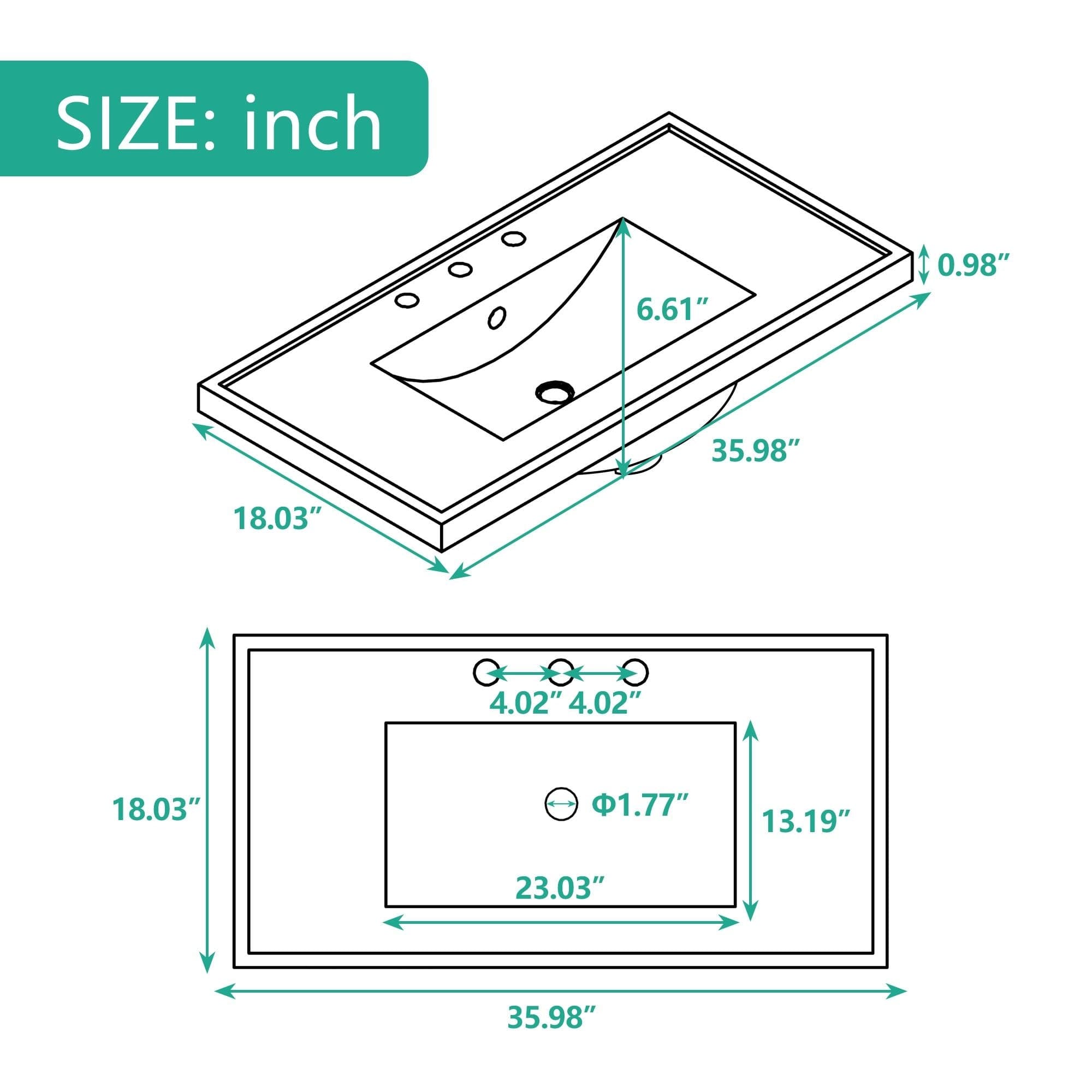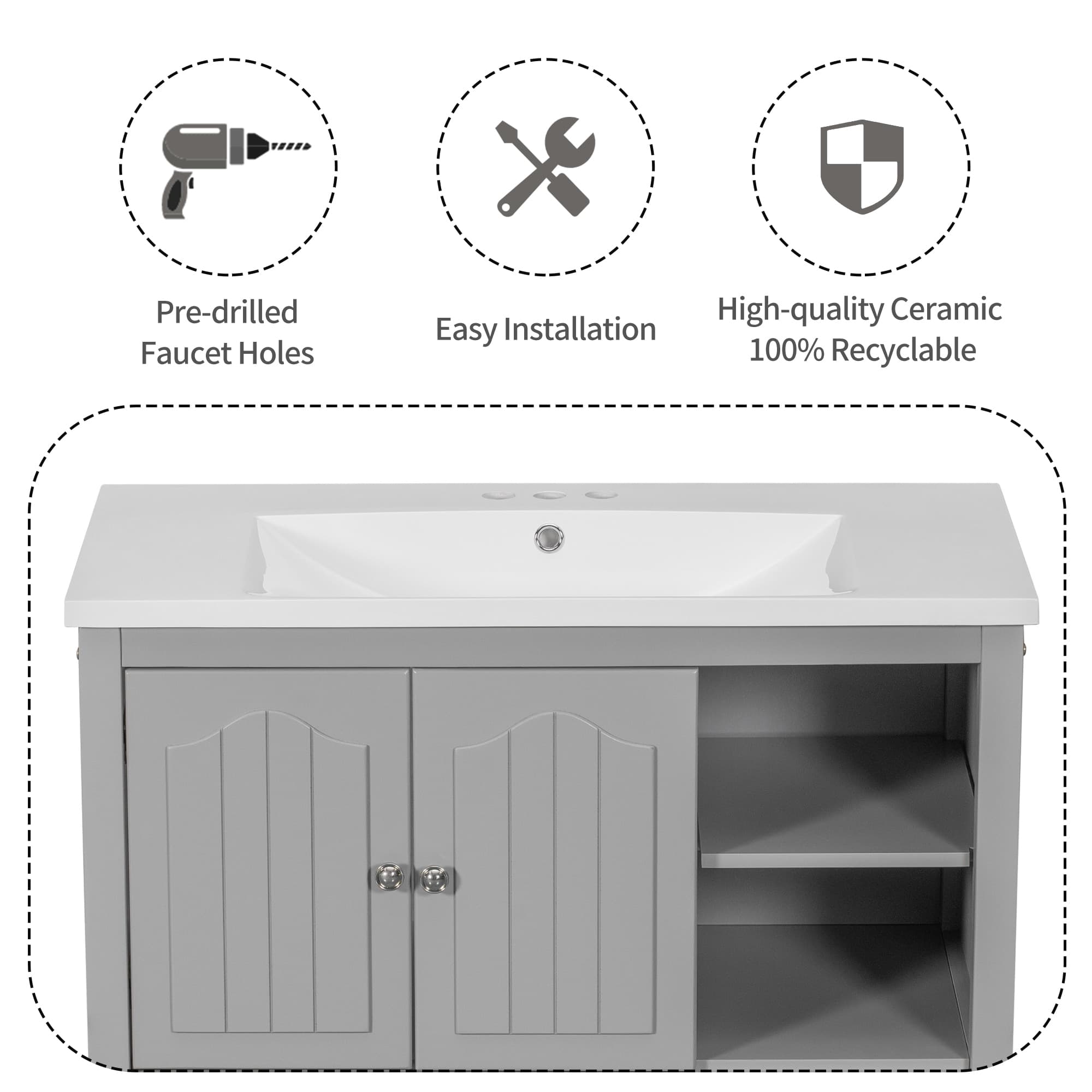 Specification: Color:White/Grey Material: Solid Pine Wood + MDF Board + Ceramic Overall Product: 36.00"L x 18.03"W x 32.13"H Weight: 99.2lbs Sink Top: 36.00"L x 18.03"W x 6.61"H Sink Top Weight: 41.88lbs Cabinet Base: 35.04"L x 17.52"W x 31.02"H Cabinet Base Weight: 57.32lbs Description: Transform your bathroom with this stylish 36" Bathroom Vanity featuring a durable ceramic basin. Designed for optimal organization, this vanity includes two spacious doors and drawers for ample storage of your bathroom essentials. The solid frame ensures longevity, while the sleek metal handles add a modern touch. Perfect for both functionality and aesthetic appeal, this vanity is an excellent addition to any bathroom. Key Features: Stylish & Functional: This 36" vanity features a contemporary design with a sleek ceramic basin, perfect for the look of any bathroom. Ample Storage: Equipped with two doors and multiple drawers, providing organized storage for toiletries, towels, and other essentials while keeping your space clutter-free. Durable Construction: Crafted from high-quality materials, ensuring long-lasting durability and resistance to daily wear and tear. Easy to Clean: The smooth ceramic basin and cabinet surfaces are easy to maintain, allowing for quick cleaning and upkeep. Versatile Design: Ideal for both modern and traditional bathrooms, adding a touch of and functionality to your decor. Easy Installation: Designed for hassle-free setup, making it simple to upgrade your bathroom with this stylish vanity.