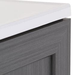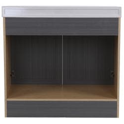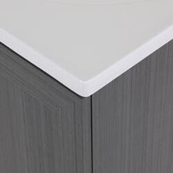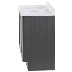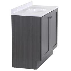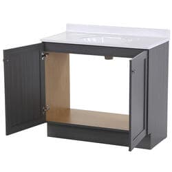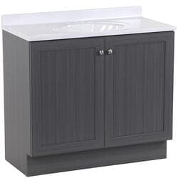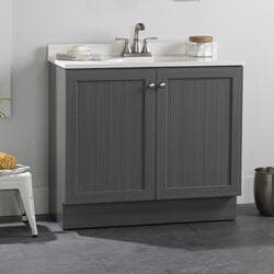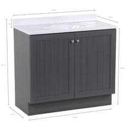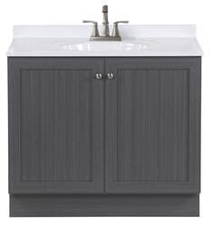 Give your bathroom with a fresh new look with the Winston 36.5 in. W bathroom vanity in our popular Phantom gray woodgrain finish. This Shaker-style bathroom vanity is constructed of engineered wood with a laminate finish and includes durable rigid thermofoil doors that resist moisture. This pre-assembled bathroom vanity comes complete with an unattached 1-piece cultured marble sink top with a 2.62-inch integrated backsplash and satin nickel hardware for quick and easy installation.