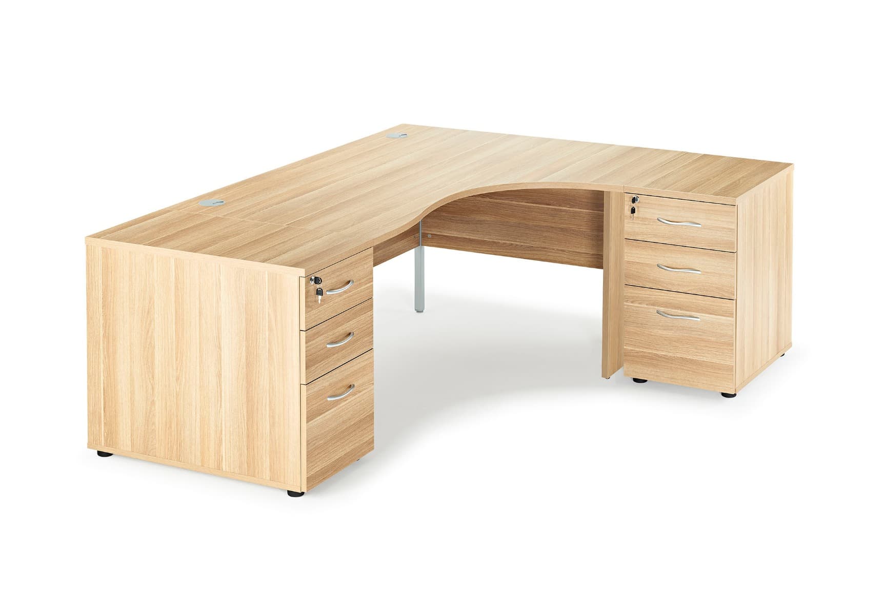 Introducing the Curved American Light Oak Panel Leg Desk and 2 Desk High Pedestals Bundle, a superior office furniture set that combines style and functionality. The desk features 25mm thick panel legs, providing stability and durability. The 25mm thick tops of the desk offer ample workspace, and two cable ports ensure a tidy and organized setup.