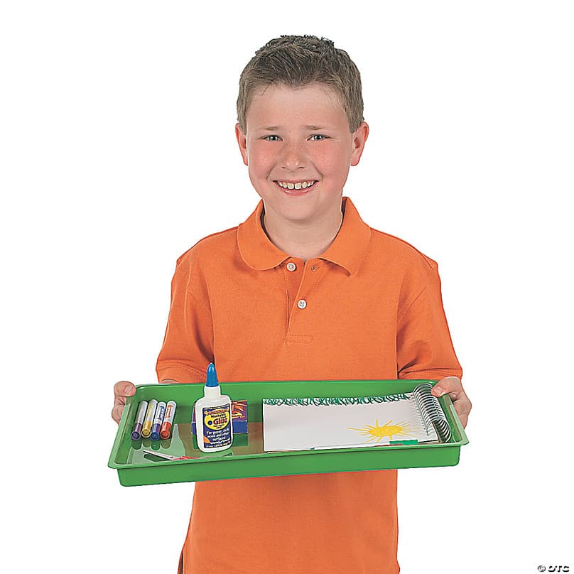 • TEACHER TOOL: Students can contain their clutter with these colorful and stackable trays. • WHAT'S INCLUDED: Each set includes 6 durable, plastic trays in an assortment of rainbow colors, including red, orange, yellow, green, blue and purple. These trays are easy-to-clean and perfect for mobile activities. • DESIGNED FOR CLASSROOMS: These colorful and reliable trays are ideal for organizing supplies and papers and just the right size for little hands. • VERSATILE USE: Kids can easily carry these trays while working with messy materials. Teachers can also use the trays for handing in homework or for general organization. Product Description:Minimize the mess with these Easy Clean Flat Trays! Ideal for easy clean-up after classroom craft time, these plastic trays are excellent for painting projects and other fun classroom crafts. Plus, these sturdy trays are easy for students to carry, in addition to being handy for keeping student art supplies all in one place. Six trays in assorted colors add bright hues to your classroom supplies as well!Specs: Size: 16 x 12 x 1, Quantity: 6, Material: Plastic, Brand: © OTC - Oriental Trading Company, We've listened. This product was improved based on customer ratings and reviews.