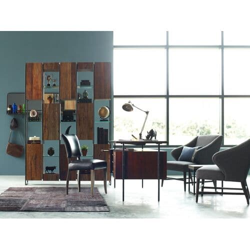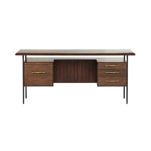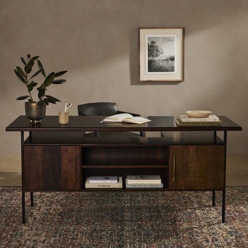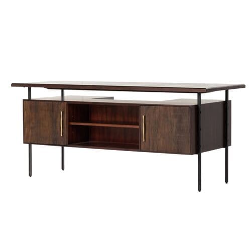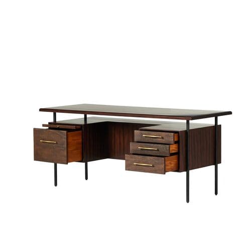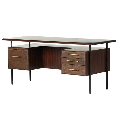 The Mallory Desk is a masterful blend of functionality and modern design, crafted in collaboration with the esteemed designer Thomas Bina. This legal-style desk provides ample storage with its dual cabinetry, perfect for organizing legal and letter-size documents. Its floating top and iron legs lend a contemporary and airy feel, while the use of solid and reclaimed materials showcases a commitment to quality and sustainability. This piece is part of a unique collection that highlights reclaimed wood-driven case goods and Brazilian-inspired upholstery, reflecting a partnership that began in the early 2000s with a renowned Los Angeles furniture designer.