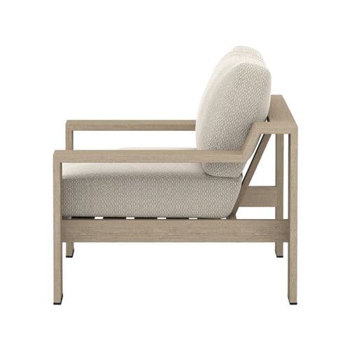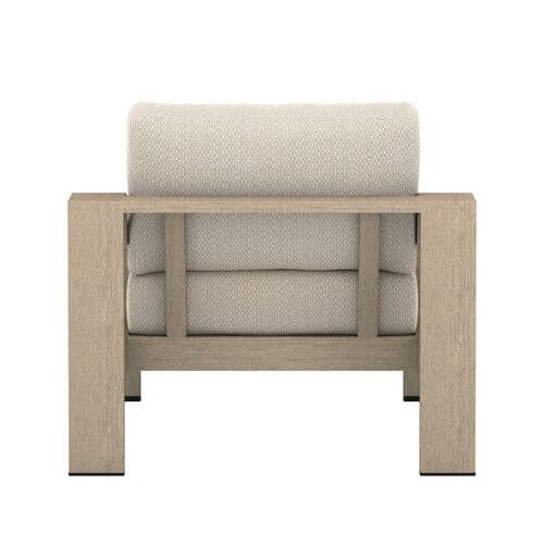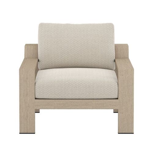Modern materials craft a stylish silhouette for the outdoors with the Kyrie Outdoor Chair. A wide, clean frame made from washed brown teak supports UV-resistant and water-repellent Sunproof fabric. The architectural arms add a touch of intrigue, making this chair a perfect blend of form and function. Ideal for any outdoor setting, it is recommended to cover or store the chair inside during inclement weather.