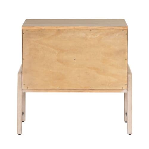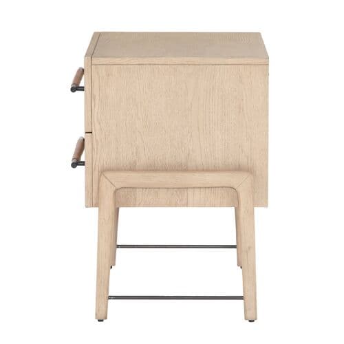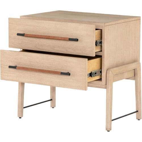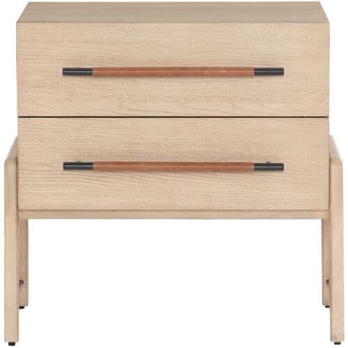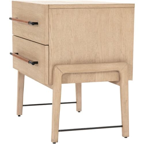 The Jeremiah Nightstand presents a refined silhouette, crafted from oak with dual drawers that offer ample storage. Each drawer is adorned with iron hardware, elegantly wrapped in top-grain leather, adding a touch of sophistication to its design. This nightstand seamlessly blends functionality with style, making it a perfect addition to any bedroom setting.