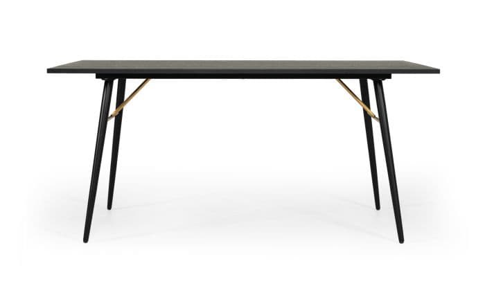 Showcasing a streamlined stylish design is the Modrest Billy Modern Black Oak & Gold Dining Table. Featuring a rectangular table top in black oak veneer finish with wood marks, it stands tapered matte black metal legs. With horizontal and angled gold stainless steel leg supports, this dining table makes room for 4 persons comfortably. A picture of class and taste, this modern dining table makes a great centerpiece in your dining space and even in your patio.