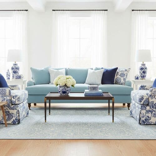 Exclusively at One Kings Lane, this sofa combines style and comfort with a kiln-dried hardwood frame and classic English arms. Upholstered in Crypton, it offers eco-friendly, stain-resistant fabric perfect for families with kids or pets. The plush feather-and-down filling provides lasting support, while the front legs with caster wheels enhance mobility and prevent floor damage. Includes two matching throw pillows. Made in the USA.