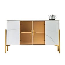 Glam Polished Finish Dining Buffet Stone Top Sideboard with Legs - Bright Gold White 55