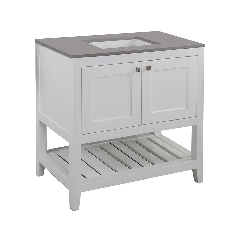 Free standing under-counter vanity with two doors and slotted shelf in wood; polished chrome pulls included but not installed (installed upon request).