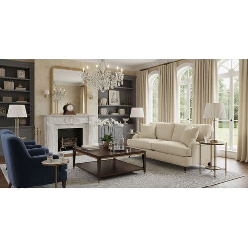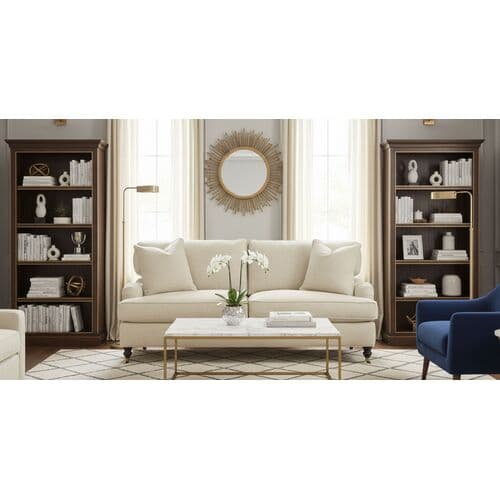 Exclusively available at One Kings Lane, this queen-size sleeper sofa is built with a kiln-dried hardwood frame, featuring classic English arms and generously filled with feathers and down. Its neutral upholstery with herringbone texture allows it to blend seamlessly into any decor, while caster wheels provide effortless mobility and protect floors from scratches. It comes complete with two matching throw pillows. Proudly crafted by hand in the USA.