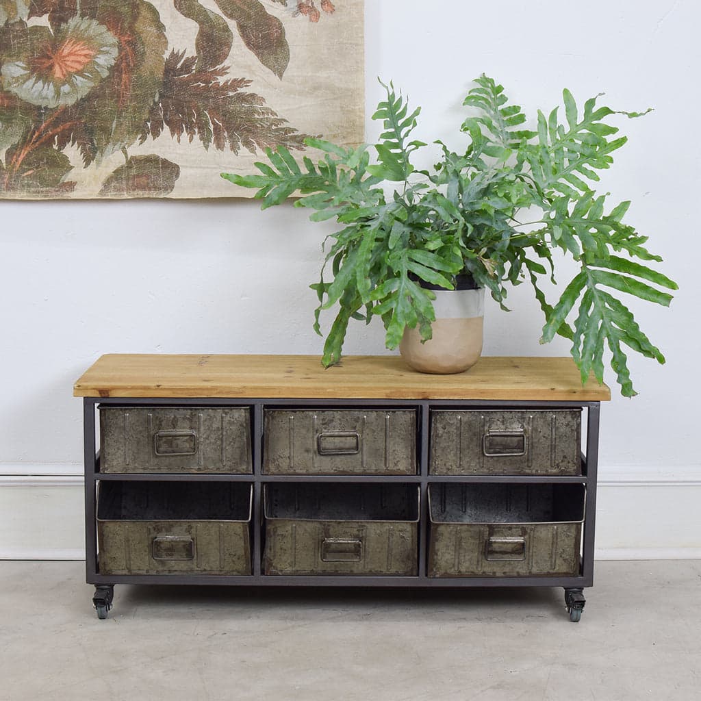 Keep your home tidy and organised with this metal industrial cabinet featuring 6 drawers and a wood top. It has a lovely rustic look and makes a perfect addition to any room - why not pop it into the hallway to use as an alternative to a shoe rack, or in your children's room as a stylish toy storage solution? Decorate it with a few plants or some coffee table books and a candle to make your home a bit more cosy. Click & Collect is available from the Crystal Palace and East Dulwich shops - just choose "collect from store" at checkout and call or email us to arrange pick up time.