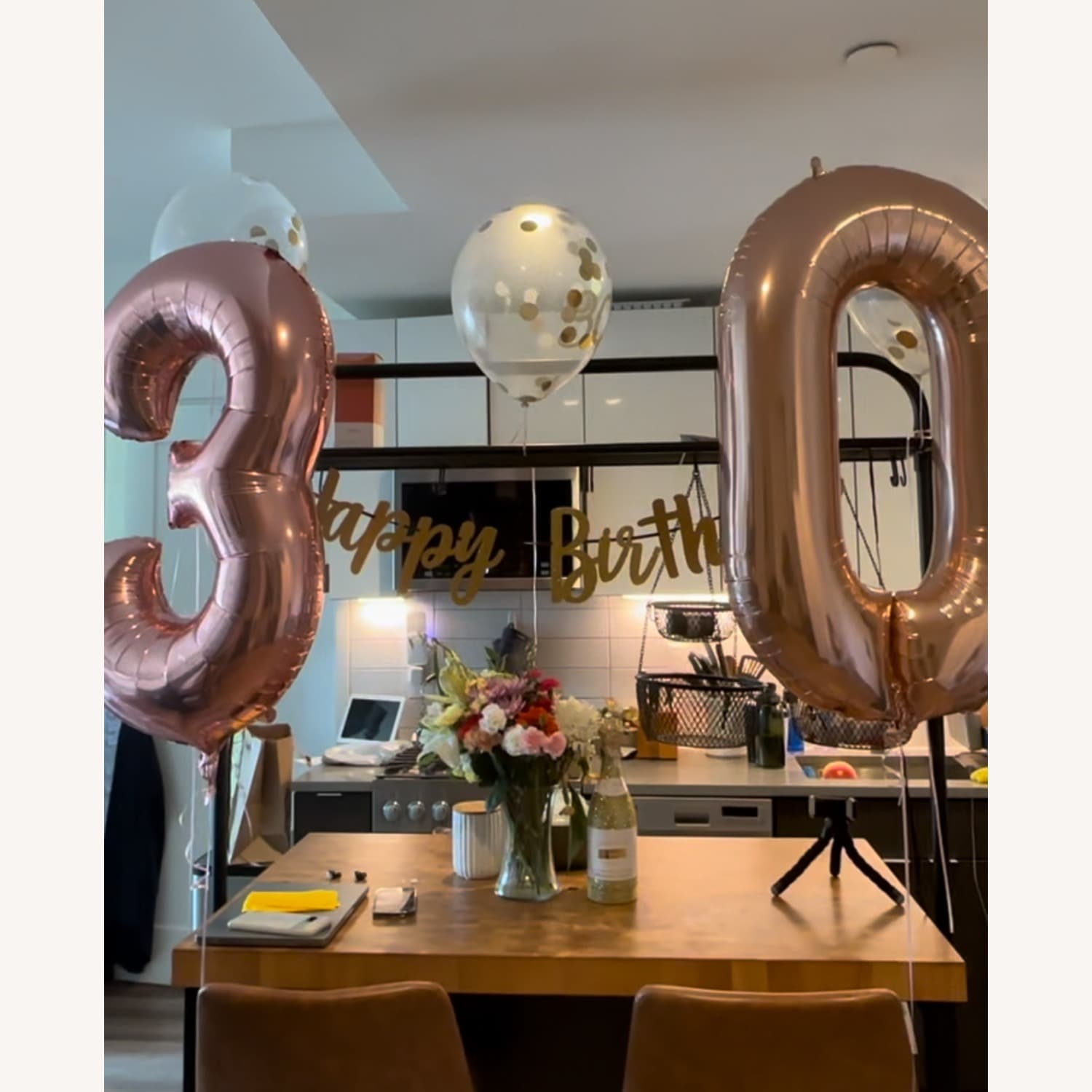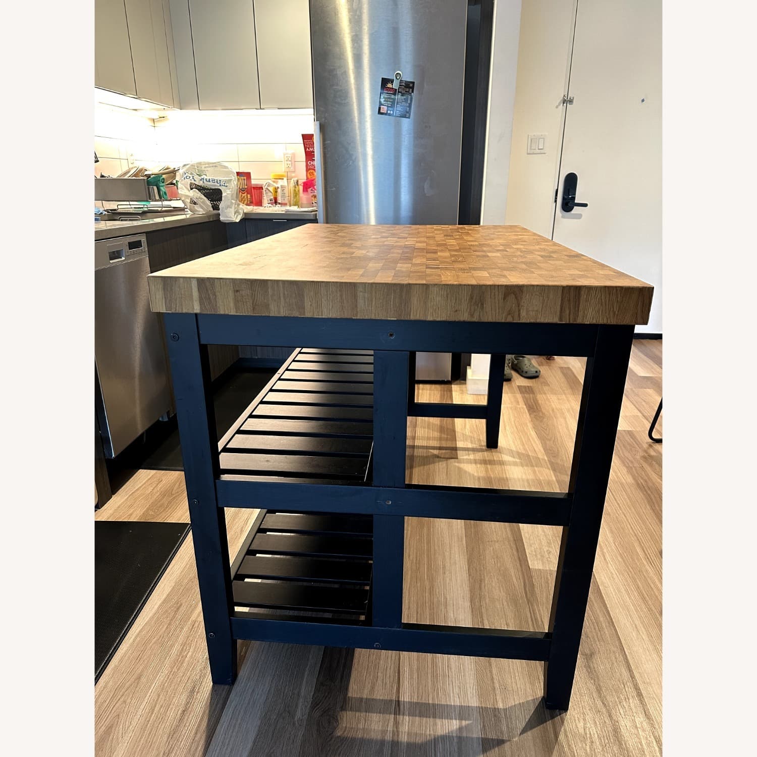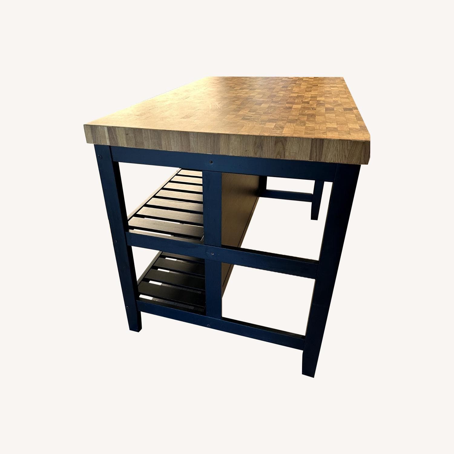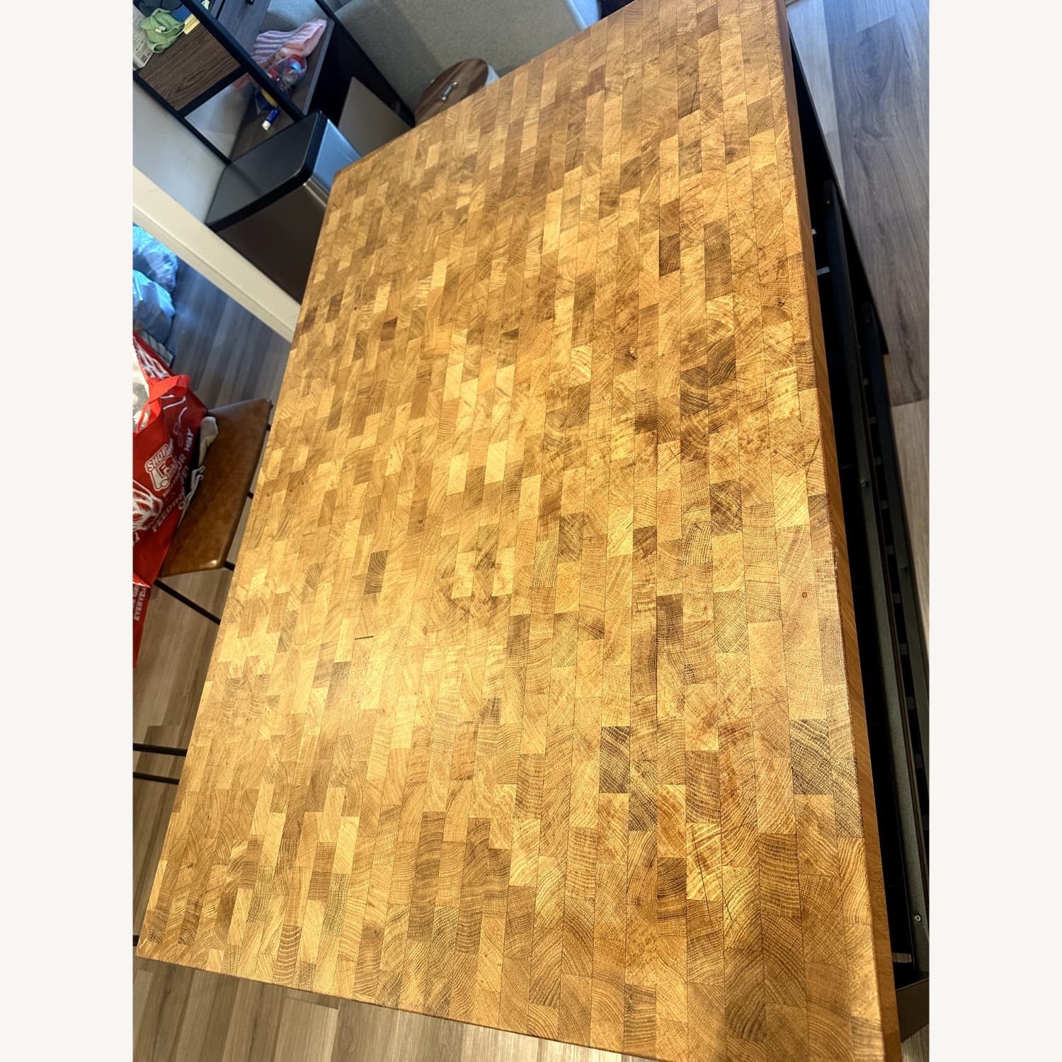 The kitchen island is the most most complimented piece in our apartment. It is sturdy, beautiful and large. Offers a great amount of additional counter space for cooking while also serving as a great dining space. It has some scratches and normal wear and tear in the wood top, which are hard to see due to the design but will last for many more years.