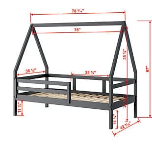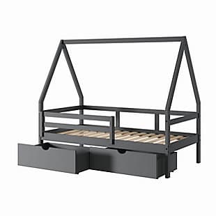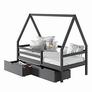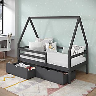 Experience the magic of the A-Frame Modern Twin Dark gray House Bed with Dual Under-Bed Drawers by Donco Kids. Crafted from solid pine and adorned with a non-toxic dark gray finish, this bed transforms your child's room into a haven of adventure and organization. Its whimsical open roof A-frame design sparks creativity, making bedtime a cherished memory. The front guardrail can be removed to convert this bed into a daybed. With the convenience of dual under-bed drawers, tidying up becomes a breeze. This bed offers a sturdy 180 lb. weight limit, prioritizing safety. Rest assured, as it meets or exceeds ASTM/CPSC standards. With over three generations of dedication to children's furniture, Donco Kids continues to blend style, durability, and functionality in every product. Unleash your child's imagination with this captivating house bed, where dreams and organization meet.