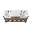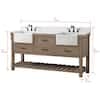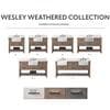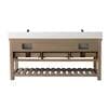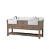 Wesley Weathered 72 in. freestanding bathroom vanity, where rustic country charm meets farmhouse style to create the ideal farmhouse apron sink and open shelf design vanity. Crafted from solid wood, wood veneer and MDF, this vanity exudes durability and quality that lasts. Its stunning engineered stone Ariston white countertop, complete with three pre-drilled holes for easy installation of fixtures and 2 deep farmhouse apron sinks, adds a touch of elegance to any bathroom. Featuring 4 full extension soft-close dovetail drawers and an open shelf design, this vanity offers ample storage space for all your bathroom essentials. The Wesley Weathered collection arrives fully assembled, including hardware, backsplash, countertop and sink, for a seamless installation experience. Choose from three rustic finishes - white wash, weathered gray and weathered natural - each complemented by matte black hardware, to match your unique style preferences. Available in sizes including 36 in. 42 in. 48 in. 54 in. 60 in. and 72 in. the Wesley Weathered collection caters to various bathroom dimensions, making it the perfect choice for any space. Elevate your bathroom with the timeless appeal of the Wesley Weathered collection. Shop now and transform your space with this charming farmhouse bathroom vanity in a weathered finish.