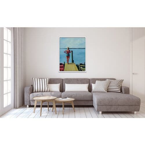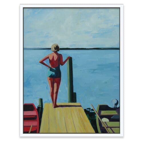 Inspired by midcentury snapshots and film stills, this piece from T. S. Harris features a woman on the dock, enjoying the views of a lake on a carefree summer day. This work is printed on gallery-wrapped canvas, displayed in a white pine floater frame, and arrives ready to hang.The California artist T.S. Harris takes old black-and-white snapshots, often found at flea markets and yard sales, and lights them up with color. Her subjects are nostalgic, like her series on film stars of the 1940s and ’50s and her scenes of long leisurely summers. Harris makes each painting come to life by cropping into each scene, roughing up the paintwork, and weaving in a bright, light-filled palette.