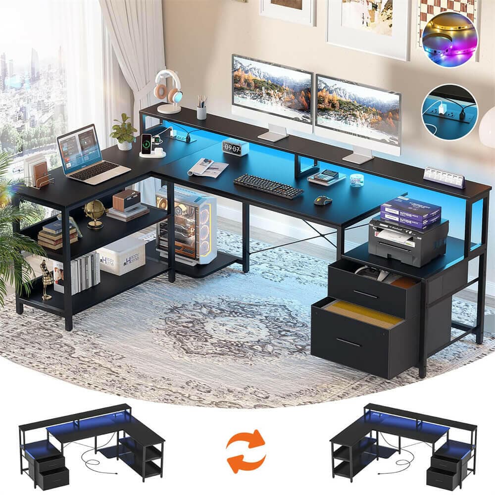 Unikito L Shaped Desk with File Drawer, 66" Reversible L Shaped Computer Desk with Power Outlet & LED Strip, Gaming Desk with Long Monitor Stand, Office Desk Corner Desk with Storage Shelf