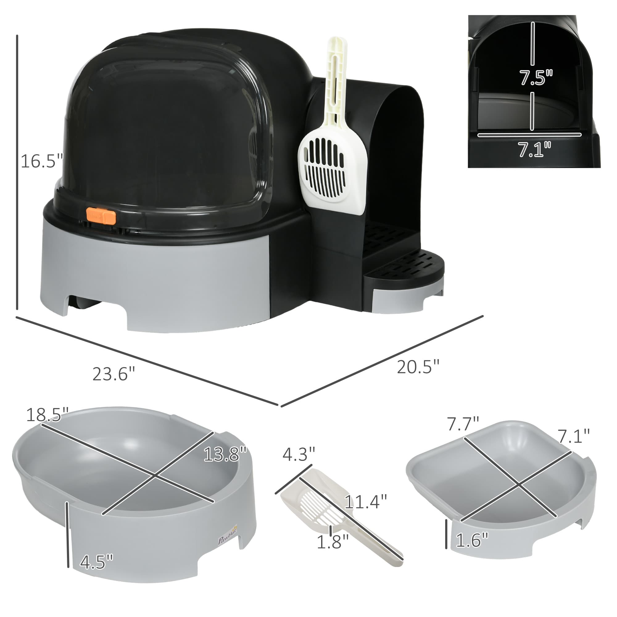 PawHut's cat litter box prioritizes your cat's privacy while providing convenience. With a door for quick access, the spacious area of this cat box offers ample room for your cat. Cleaning is effortless thanks to the removable litter tray, and a scoop that attaches to the side prevents misplacement. Unlike an ordinary cat toilet, its adorable space capsule-like shape provides a high-tech futuristic look, and its enclosed surroundings help your cat feel at ease.