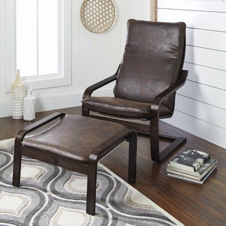 About This Item Bentwood Frame Brown Faux Leather Cushion Mahogany Finish Chair & Ottoman included Easy to assemble 1-year limited warranty Relax in comfort in the Better Homes and Gardens Sloane Bentwood Chair & Ottoman. The brown faux leather cushion provides a soft seating surface and the included ottoman adds to the comfort experience. Easy assembly and the mahogany finish complements many Better Homes and Gardens pieces. Specifictions Brand : Better Homes & Gardens Color : Brown Manufacturer Part Number : CR-48357 Assembled Product Dimensions (L x W x H) : 26.38 x 34.25 x 38.63 Inches